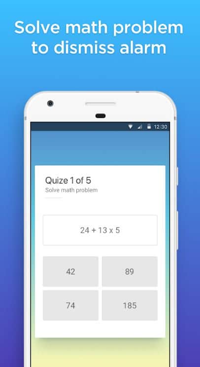 Несколько вариантов отключения будильника ( решить пример, задачу, трехсекундная улыбка на камеру устройства, встряхивание смартфона)
