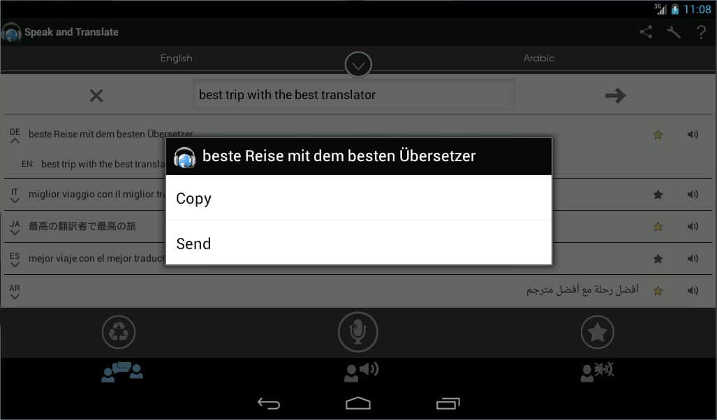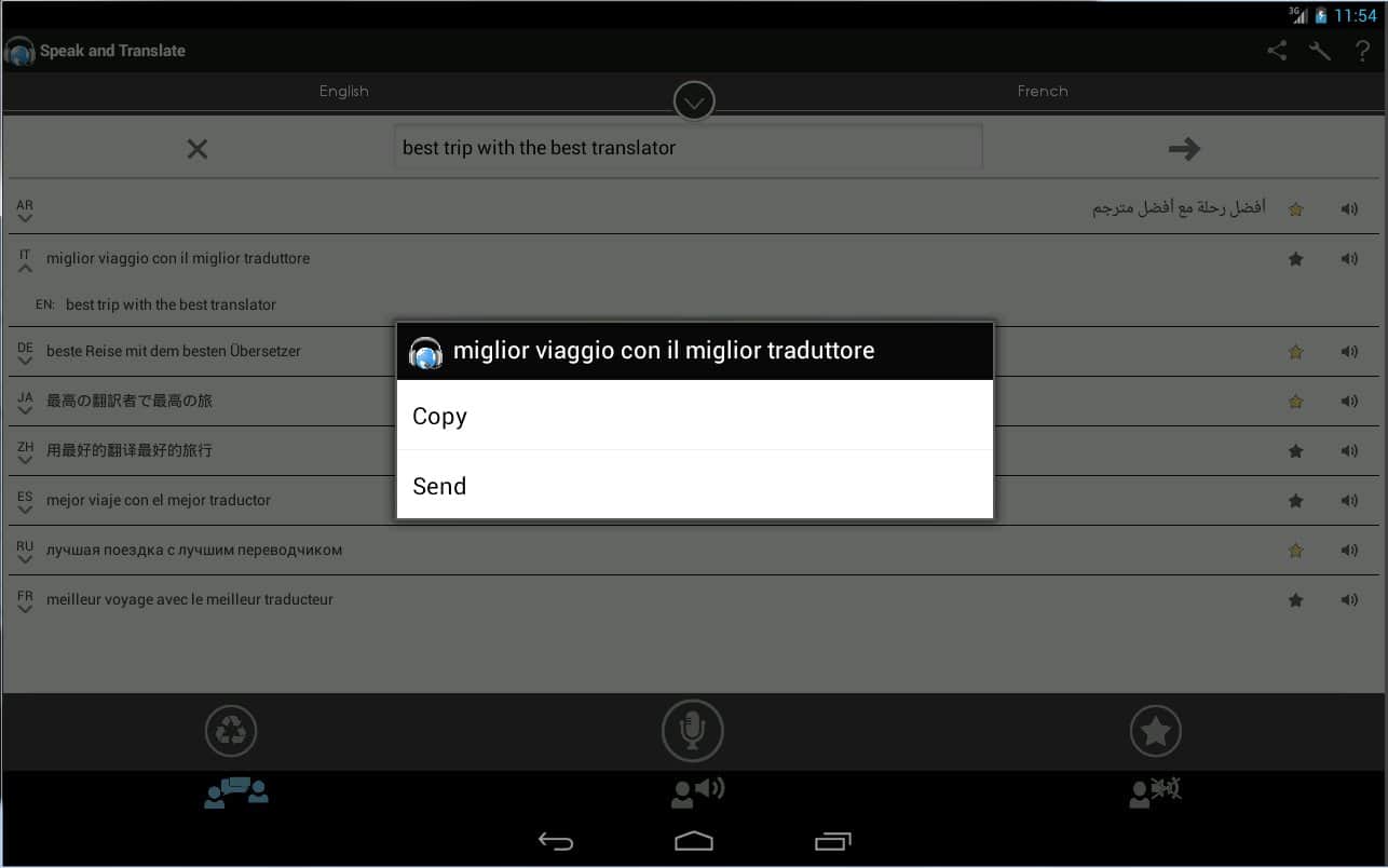 Speak And Translate - Хорошее приложение на андроид превратит ваше устройство в синхронного переводчика. Реализована функция голосового перевода с автоматическим распознаванием речи на 69 языках.