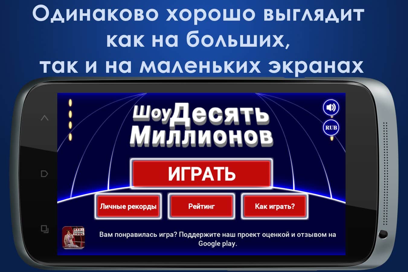 10 Миллионов – великолепная викторина, в которой вам предстоит отвечать на интересные вопросы, выбирая один правильный ответ из нескольких предложенных. В начале игры даётся 10 миллионов рублей, их необходимо сохранить до конца викторины. Распоряжаться деньгами можно по своему усмотрению, всю сумму можно поставить как на один ответ, так и разделить на несколько.