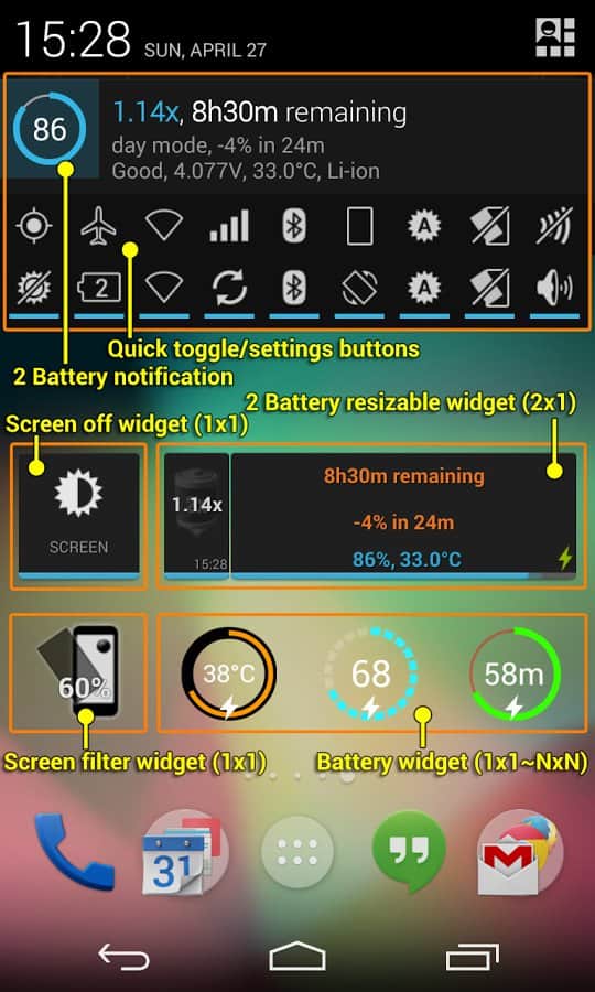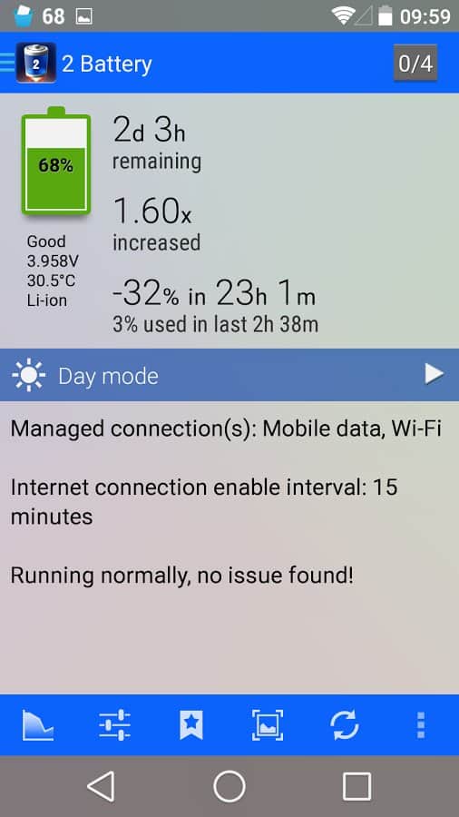 Приложение будет интересно всем, кто сталкивался с проблемой быстрой разрядки батареи. С помощью 2Battery можно гибко настраивать работу приложений в фоновом режиме, использование беспроводных подключений, переключаться в ночной режим, автоматически регулировать яркость экрана и при необходимости создавать белые списки для приложений (на них не будет распространяться работа 2Battery). Кроме того, приложение отличается большим диапазоном настроек, среди которых наличие и изменение значка в статусной строке, виджеты, звуковые уведомления и многое другое. Не смотря на обилие настроек, разобраться с программой не сложно, ведь внутри неё все удобно систематизировано.