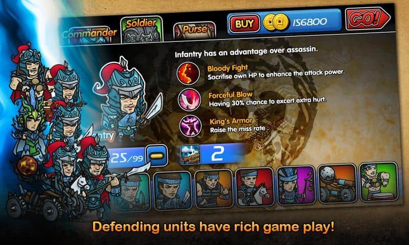 3 Kingdoms TD:Defenders' Creed - очередная игра стиля Tower Defense достойна внимания однозначно! Игра очень напоминает Plants Vs Zombies - так что напрягаем извилины, разрабатываем стратегические шаги и побеждаем! Но придется поработать для начала, а уж потом, как говорится, снимать сливки! Речь идет о войнах в Китае в период Троецарствия - вы защищаете свои позиции, отправляя вперед юнитов и защищая тем самым башни. Если враг прорвет вашу оборону - практически поражение, но есть еще главный герой, который наблюдает за ходом битвы и если пахнет жареным, то можно применить его особые умения и навыки и неимоверным образом исправить ситуацию. По мере прохождения вы будут приобретать опыт и навыки, будут появляться новые типы воинов и защиты.