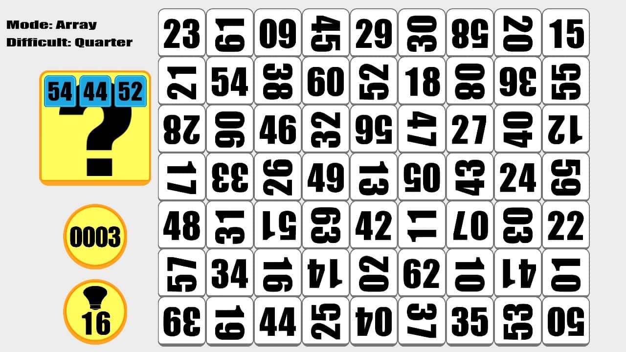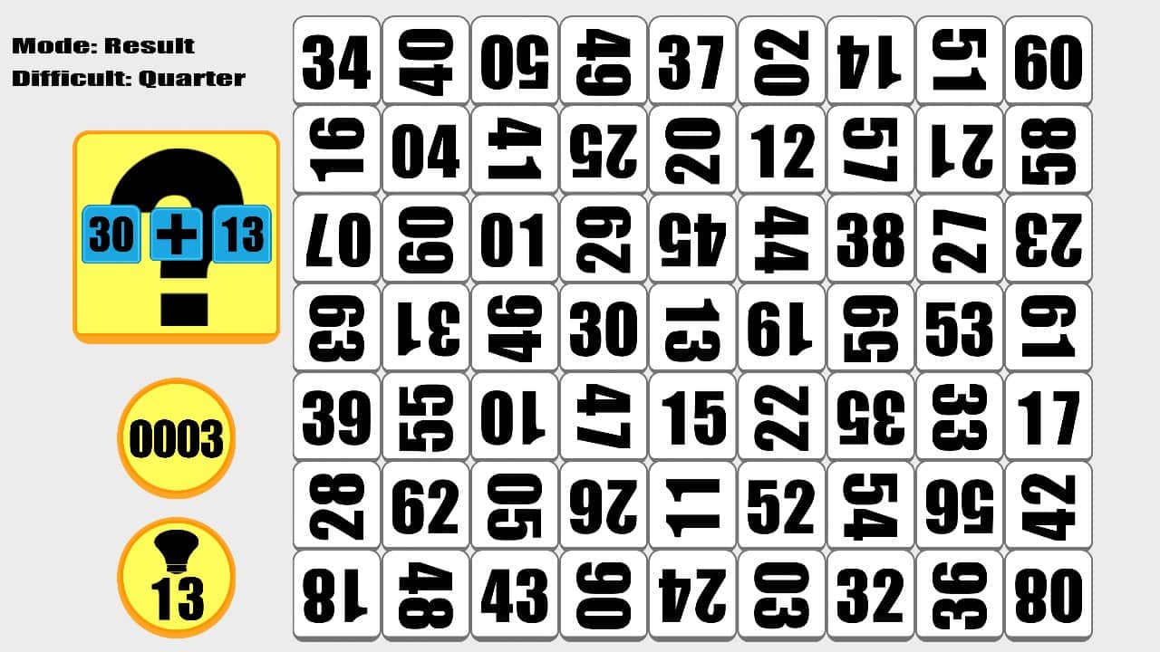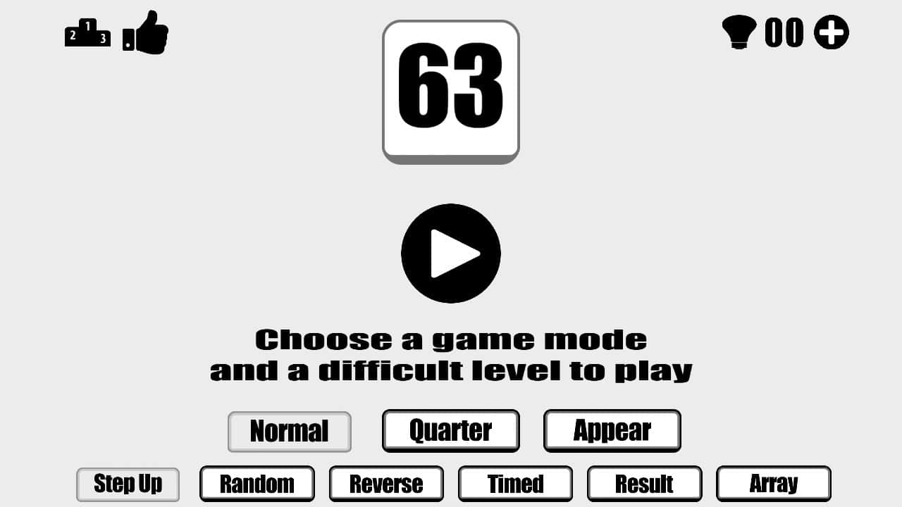 63 – Counting Number Puzzler – головоломка на андроид, где вы будете выполнять не сложные математические задачки. Перед вами в этой игре откроется поле поделенное на ячейки, в каждой из которых находятся числа от 1 до 63. Вашей задачей будет в зависимости от выбранного режима искать определенные цифры на время, выполнять различные математические действия и искать группы чисел. Прилагайте всю свою наблюдательность и логику для того чтобы проходить один за другим многочисленные уровни и устанавливать рекорд. В игре представлено шесть режимов игры, 3 уровня сложности и многочисленные подсказки.