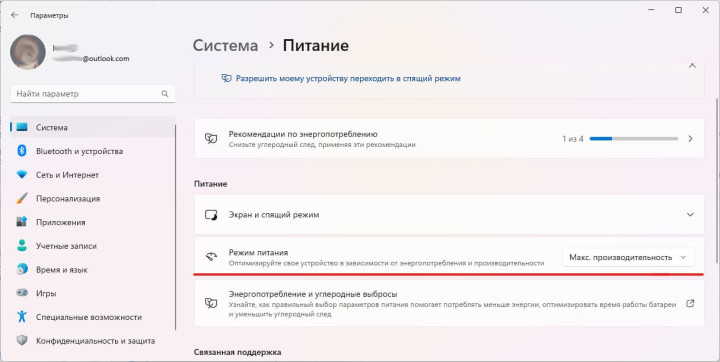 Различные режимы питания важны для ноутбуков, часто работающих от встроенного аккумулятора, однако если вы владелец компьютера, работающего от электросети, нет смысла использовать что-то кроме максимальной производительности. Для этого переходим по пути Пуск — Параметры — Система — Питание — Режим питания — Максимальная производительность.