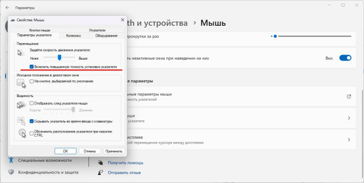 Скоростью указателя и другими его характеристиками можно управлять из настроек Windows и, скорее всего, из настроек интересующих вас игр. Проблема в том, что эти функции могут конфликтовать между собой. Чтобы избежать конфликтов, рекомендуем придерживаться стандартных параметров. Используемые настройки проверяем по пути Пуск — Параметры — Система — Bluetooth и устройства — Мышь, где находим Дополнительные параметры мыши. В открывшемся окне переходим во вкладку Параметры указателя и снимаем маркер напротив пункта Включить повышенную точность установки указателя. Если вы играете мало и в какую-то конкретную игру, можно отключить точность указателя оттуда, оставив активным маркер в настройках Windows.
