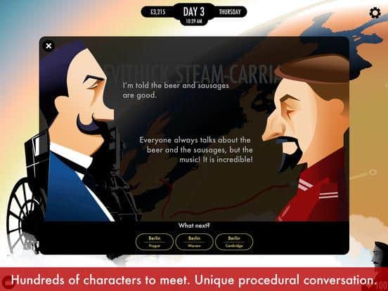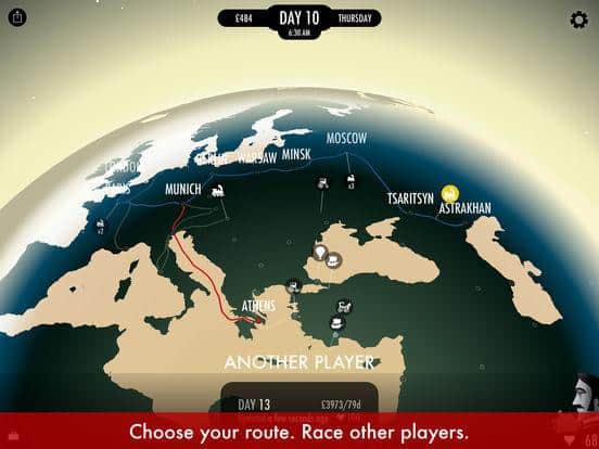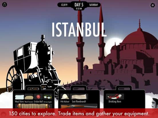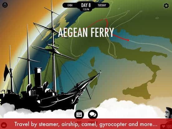 80 Days – интерактивное приключение для IOS, где вы будете путешествовать по всему миру и выполнять различные миссии и задания. В этой игре вы будете выступать в роли камердинера Филеаса Фогга с которым отправитесь в опасное путешествие, пересекая города и страны на поездах, пароходах, воздушных шарах, лодках, верблюдах, лошадях и других средствах передвижения. Вы должны постоянно следить за здоровьем своего хозяина, своими финансами и временем и не принимать опрометчивые решения, которые могут привести ваше путешествие к неудачному завершению. Не дайте себе обанкротится и продавайте товары, которые принесут вам прибыль и не берите в дорогу слишком много багажа. В игре вы сможете отслеживать статистику своих конкурентов отмечать их маршрут, а также триумфы и катастрофы.