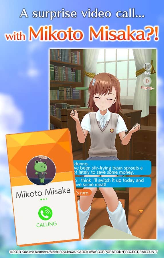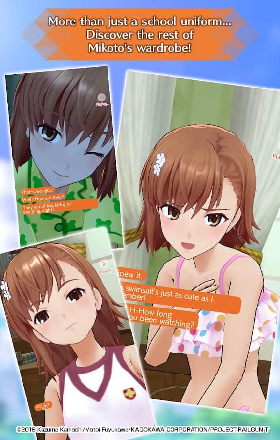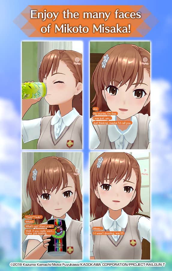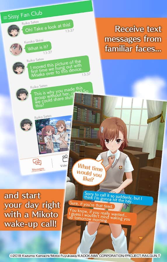 A Certain Scientific Railgun:Spectrum Story - Поддержите связь с Микото Мисакой и узнайте ее поближе! Каждый день переписывайтесь и читайте интересные истории из ее жизни, а также не забывайте периодически созваниваться и видеть главную героиню в различных образах, в зависимости от того, где она находится. Затрагивайте в диалоге любые темы, делайте правильный выбор для развития нужных вам отношений, слушайте некоторые ответы голосом, коллекционируйте фотографии с разговоров и веселитесь, теперь ваше окружение стало шире на одну виртуальную подругу.