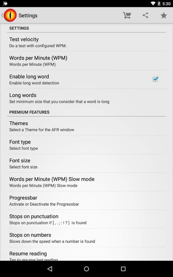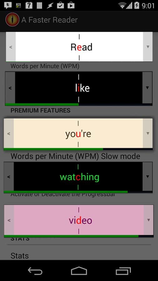 A Faster Reader - Знали ли вы что можете прочитать этот текст куда быстрее? Каждый из нас способен читать на огромных скоростях, при это не теряя смысл текста. Проблема в том что при чтении текста нам приходится передвигать глаза с конца одного слова на начало другого. Это приложение будет показывать вам все слова поочередно и на большой скорости, так же они будут появляться в одном и том же месте, таким образом вы значительно увеличите скорость чтения в 2, 3 и более раз. Учитесь читать быстро и при этом понимать смысл всего текста.