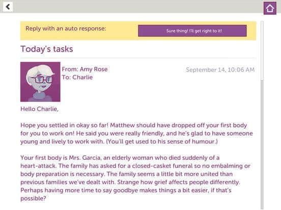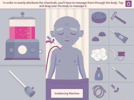 A Mortician's Tale – необычная игра для IOS, где вы будете играть роль руководителя похоронного бюро. В этой игре вы возьмете на себя роль владельца похоронного бюро, которому необходимо подготовить тело покойного, посетить его похороны и выслушать рассказы близких. Для начала вы побываете на похоронах Чарли, которого необходимо бальзамировать и затем выслушать увлекательные рассказы его близких и подчиненных. Взгляните на мир западной похоронной индустрии с юмористической точки зрения и информативности.