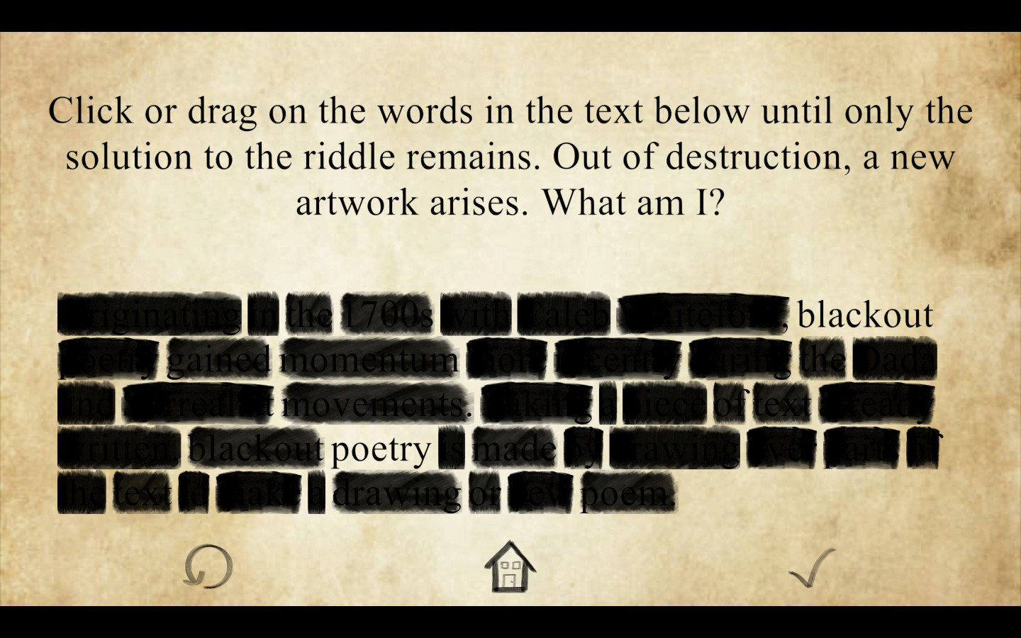 A Stroke of Inspiration - Откройте для себя магию слов в уникальной головоломке, где искусство и логика переплетаются! Создавайте «поэзию затемнения», вычёркивая ненужные слова и оставляя лишь те, что раскрывают разгадку. Каждый уровень — это интеллектуальное испытание и творческий вызов, превращающий обычный текст в загадочную поэму. Погрузитесь в атмосферу вдохновения и станьте мастером смыслов!