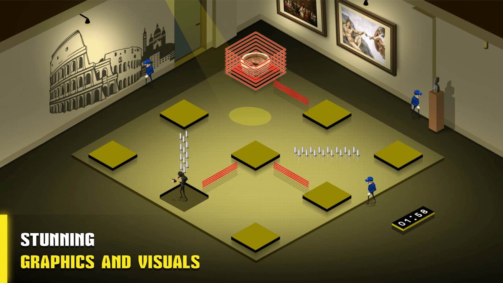 A Thiefs Journey – увлекательная игра на андроид, где вы будете управлять воришкой. В этой игре вы возьмете под свой контроль воришку которого должны провести по залам музея в каждом из которых вы должны совершить ограбление. Перемещайтесь по плиткам и проходите уровни на время. Старайтесь не сталкиваться с охранниками и не перемещаться по одним и тем же плиткам два раза. Положитесь на свою сообразительность и логику и тщательно продумывайте каждый свой ход. Всего в игре вы найдете более 70 уровней, множество разнообразных комнат и миссий. С каждым новым уровнем сложность игры будет увеличиваться и вам придется изрядно постараться чтобы пройти их все.