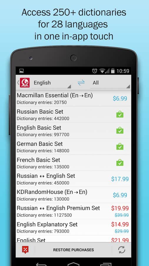 ABBYY Lingvo Dictionaries – программа позволяет делать качественный перевод слов и фраз. Возможен перевод по нескольким словарям.В приложении находятся более 250 словарей, для перевода и тематическим словарям для разных языков, из которых пользователь с лёгкостью сможет перевести любой текст.