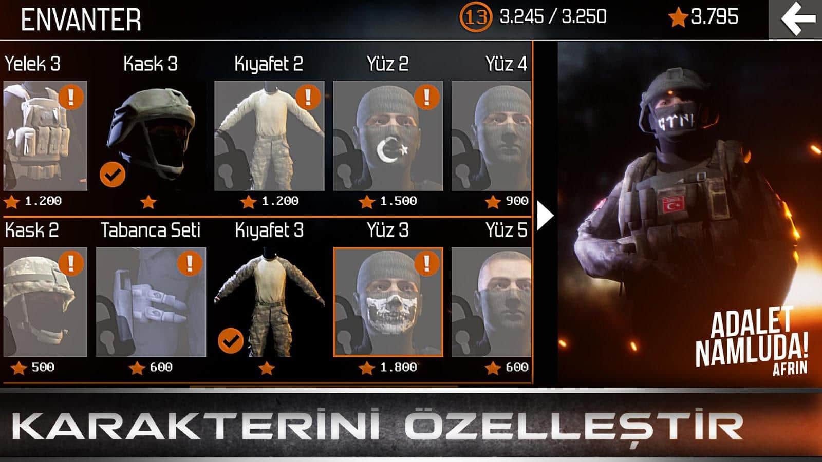 Adalet Namluda: Afrin – экшен на андроид, где вы будете управлять вооруженными силами Турции «Оливковая ветвь» для проведения массовой операции. Возьмите под свой контроль вооруженных и обученных бойцов и проведите их по различным локациям, выслеживая и уничтожая противников. Применяйте на деле все навыки и умения бойцов и подкрадывайтесь незаметно к врагам или уничтожайте их с дальнего расстояния, используя снайперскую винтовку. Открывайте для себя новых бойцов и примеряйте на них новое обмундирование и оружие. Почувствуйте себя бойцом и выполняйте все приказы командования.