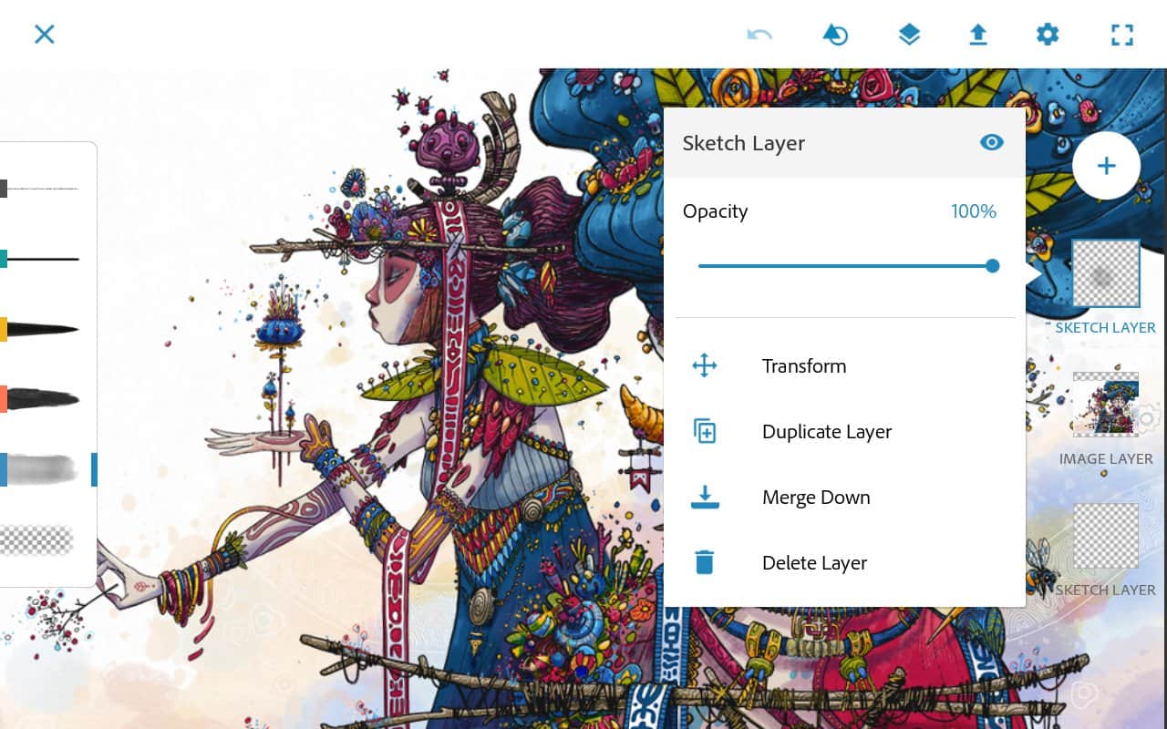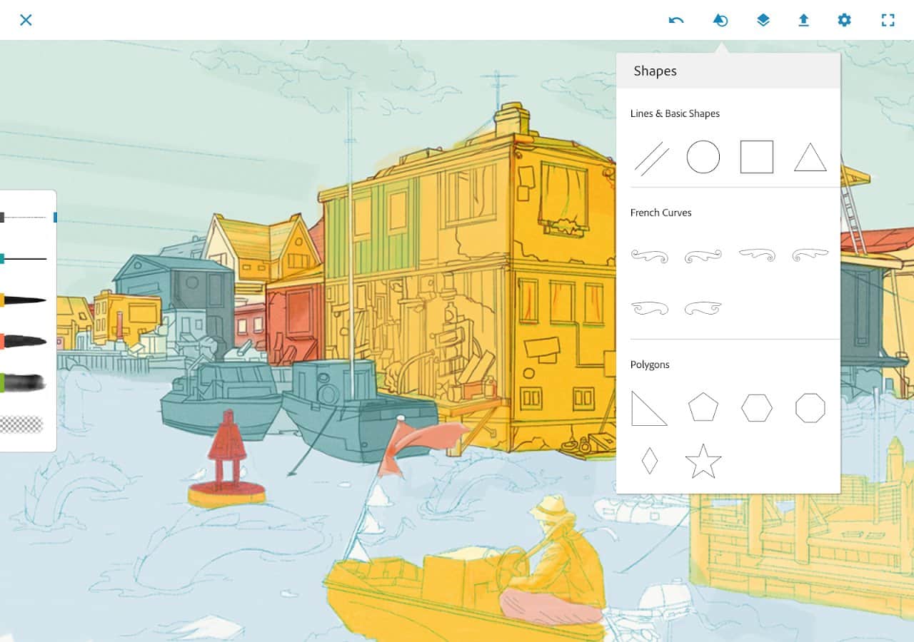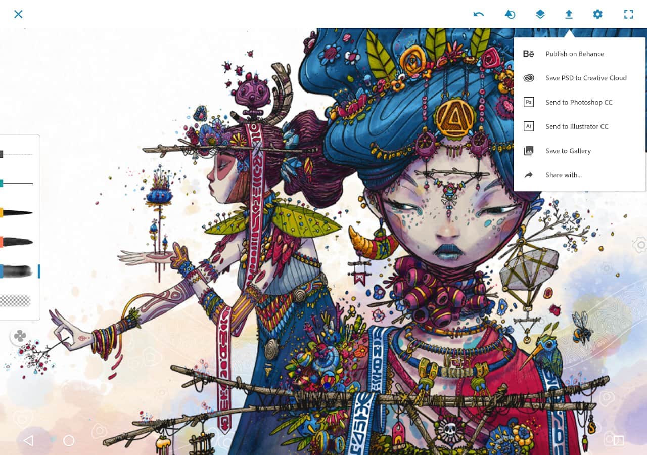 Для тех кто не знаком с Adobe Photoshop Sketch отметим, что это программа позволяющая создавать наброски рисунков при помощи различных приспособлений, карандашей, кистей, и прочего, а затем отправить работу в Adobe Photoshop CC или Adobe Illustrator CC, с использованием слоев.