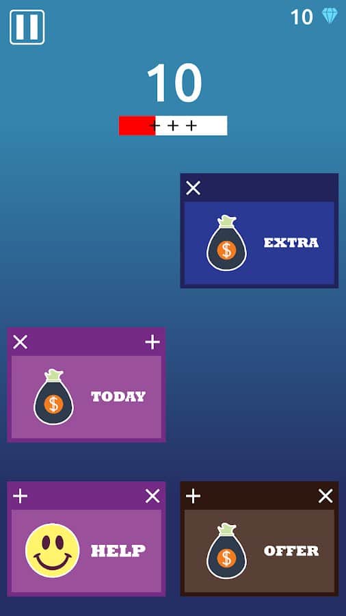 Adpocalypse – простая но увлекательная аркада на андроид, где вы будете закрывать всплывающую рекламу. В этой игре вы сможете тренировать скорость своей реакции и ловкость пальцев, нажимая в нужный момент на экран и закрывая появляющиеся окна. Будьте предельно внимательны, ведь неправильное нажатие влечет за собой появления новой рекламы. В игре вы найдете несколько режимов игры: обычный где реклама будет появляться в случайных местах экрана и иметь разный размер и плиточный режим где реклама появляется в одном месте и имеет один размер. Отслеживайте статистику и зарабатывайте внутриигровую валюту.