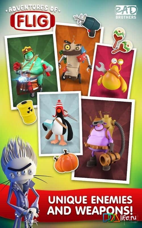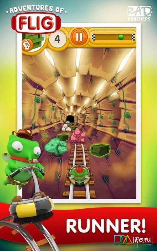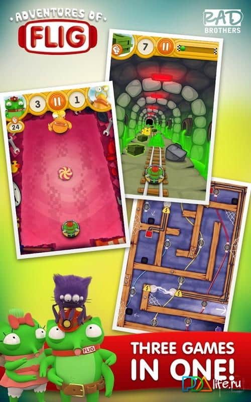 Adventures of Flig – увлекательная приключенческая игра, сочетающая в себе три вида различных жанров игры: раннер, аэрохоккей и головоломку. В этой игре вам предстоит помочь Флигу - забавному зеленому существу, отыскать свою возлюбленную похищенную злым пауком. Игра порадует вас увлекательным сюжетом с яркими разнообразными мирами, где вам предстоит бегать по заброшенному туннелю обходя все препятствия на своем пути, сыграть в аэрохоккей с приспешниками паука и пройти опасный лабиринт, пытаясь отыскать маленького паучка Спайди. Игра не даст вам скучать и порадует вас качественной графики и забавным персонажам. Вас ждут 60 уровней в 10 мирах, 40 неповторимых противников и 30 единиц оружия. Играйте и получайте незабываемое удовольствие от игры.