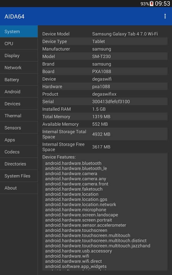 Основная задача данного приложения — сбор информации о различных параметрах устройства, причем делает это AIDA64 максимально подробно. Вся информация, разбитая на несколько вкладок, включает данные об имени и производителе вашего девайса, процессоре (тип, архитектура, частота), GPU, нагреве устройства, состоянии памяти, использовании мобильных и Wi-Fi сетей и многих других параметрах. Для Android Wear устройств предусмотрен отдельный модуль.