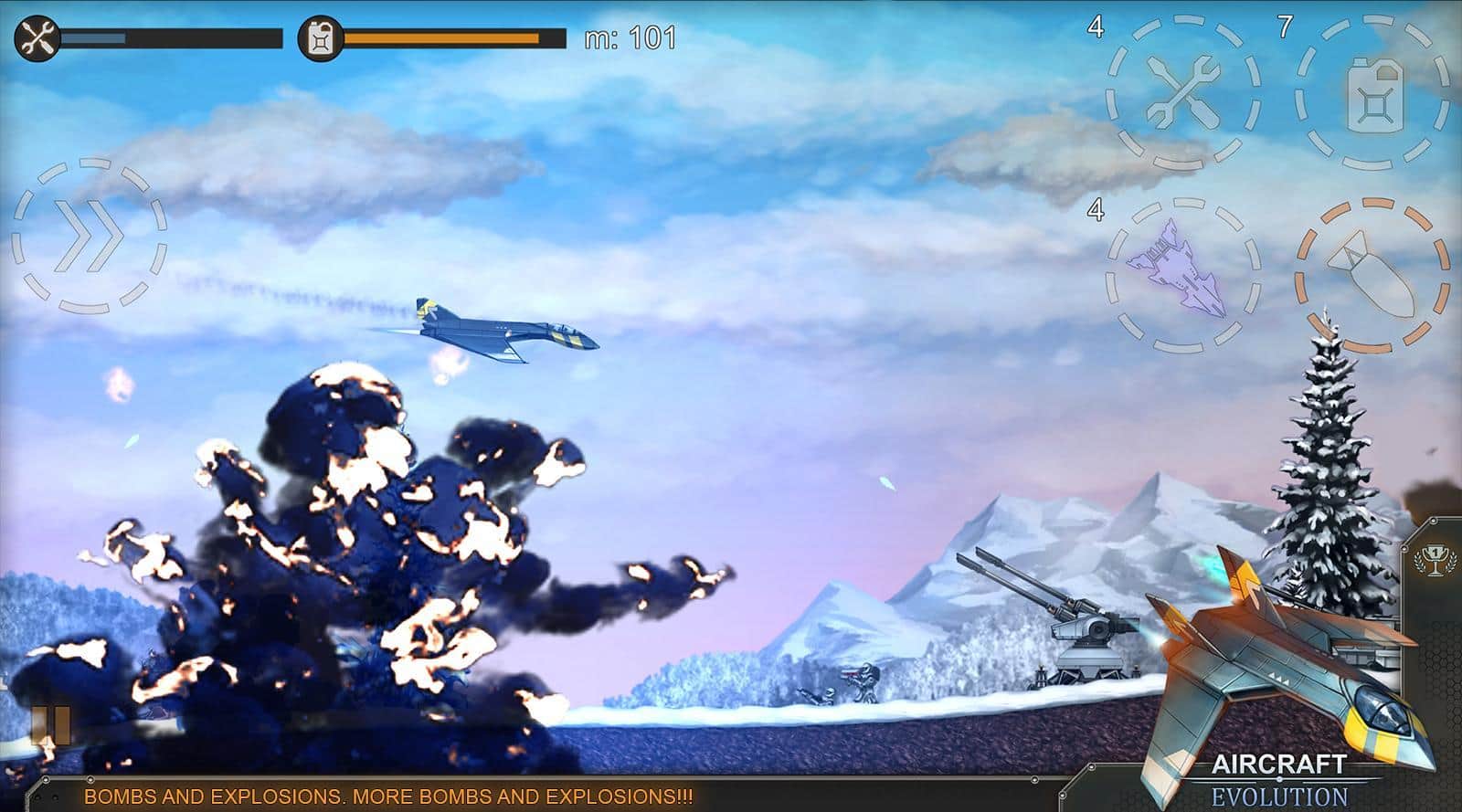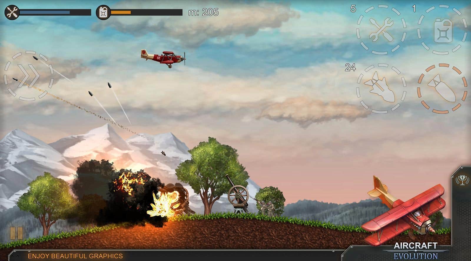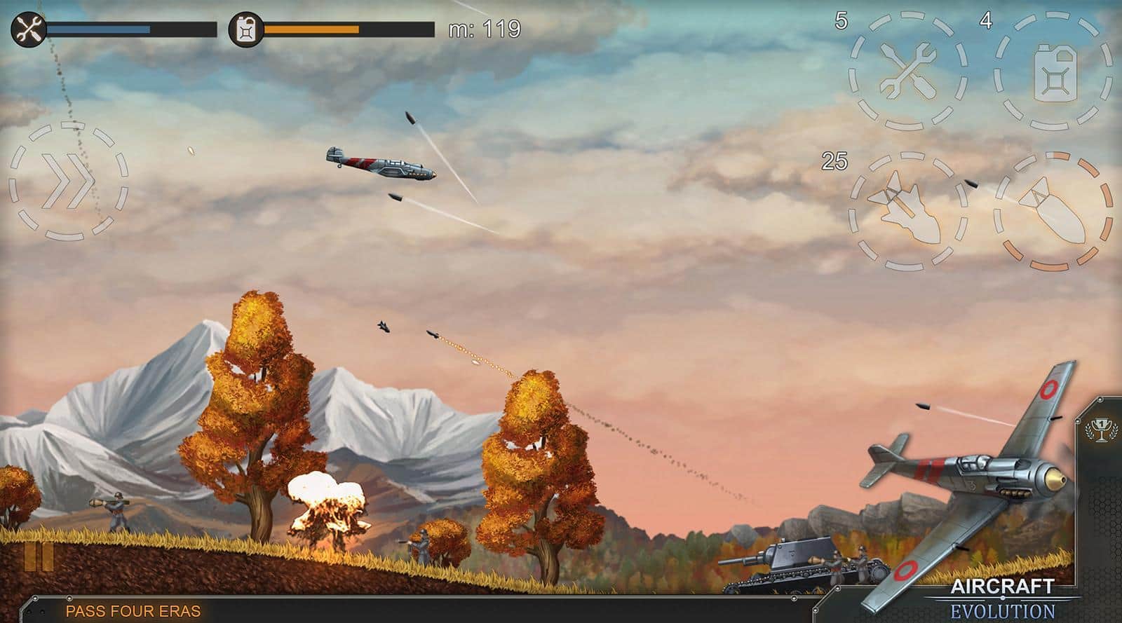 Aircraft Evolution – возьмите под свой контроль военный самолет и проведите его по опасным уровням игры. В этой игре вы побываете в разных временных эпохах и сможете проверить в действии различные самолеты. Летайте над полями сражений и сбрасывайте на врагов обстреливающих вас с земли бомбы. Совершайте невероятные маневры в воздухе, чтобы избежать огня противника. Сбрасывайте бомбы на врага, уничтожая его пехоту, артиллерию, а также такни и другую военную технику. Постоянно следите за уровнем топлива в баке и не забывайте пополнять его. Выполняйте разнообразные миссии и получайте отличное вознаграждение. Открывайте для себя новые самолеты и улучшайте их в своем ангаре.