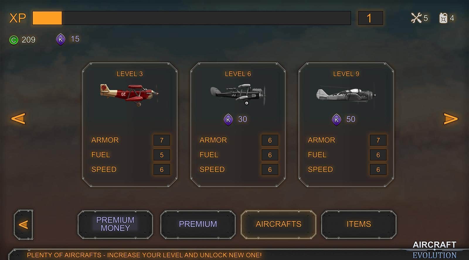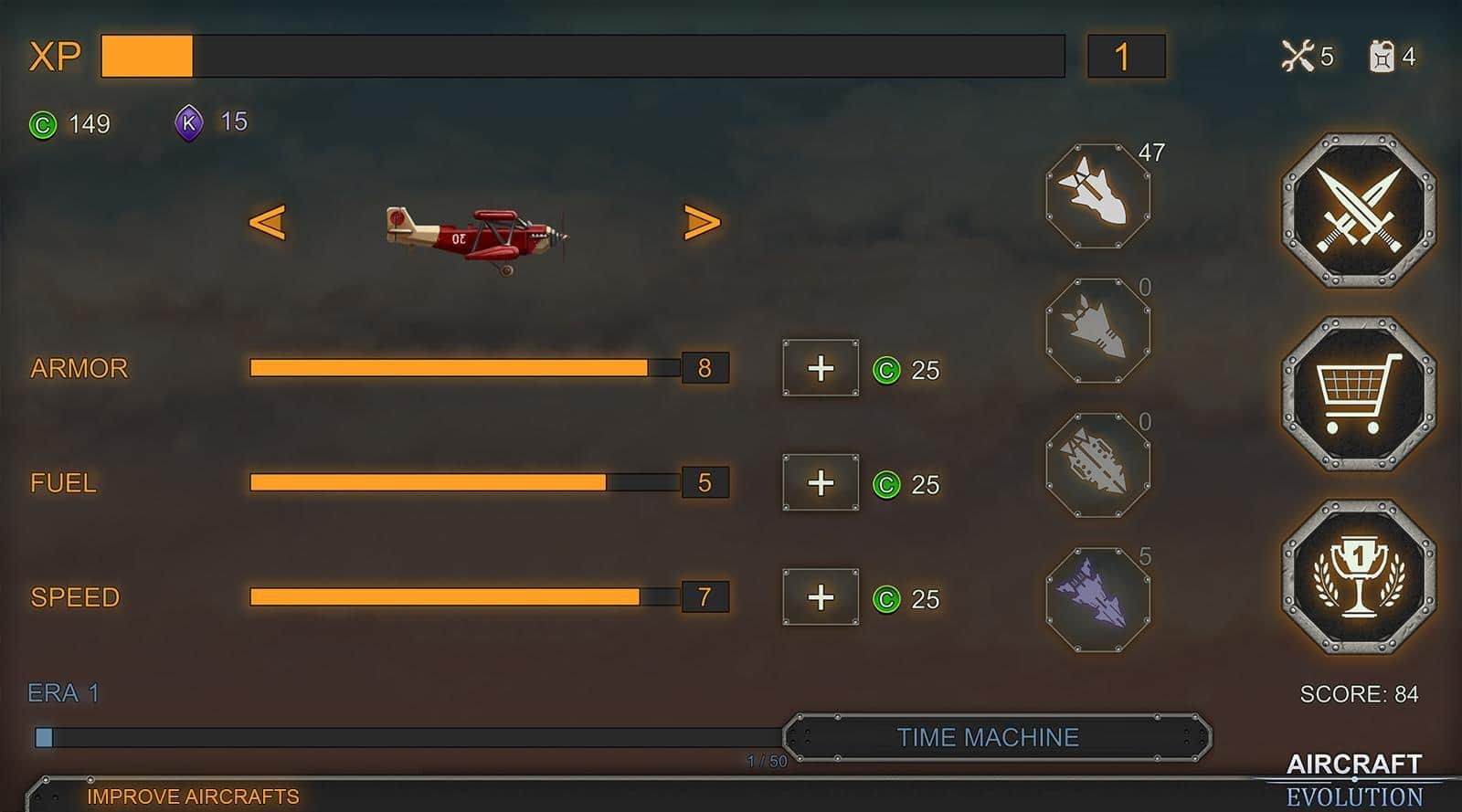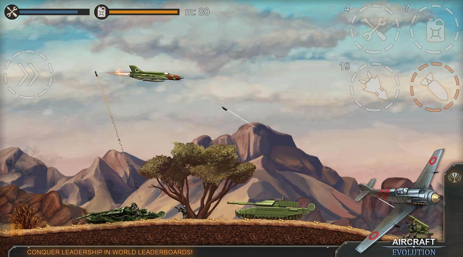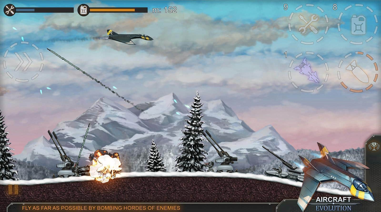 Aircraft Evolution – возьмите под свой контроль военный самолет и проведите его по опасным уровням игры. В этой игре вы побываете в разных временных эпохах и сможете проверить в действии различные самолеты. Летайте над полями сражений и сбрасывайте на врагов обстреливающих вас с земли бомбы. Совершайте невероятные маневры в воздухе, чтобы избежать огня противника. Сбрасывайте бомбы на врага, уничтожая его пехоту, артиллерию, а также такни и другую военную технику. Постоянно следите за уровнем топлива в баке и не забывайте пополнять его. Выполняйте разнообразные миссии и получайте отличное вознаграждение. Открывайте для себя новые самолеты и улучшайте их в своем ангаре.
