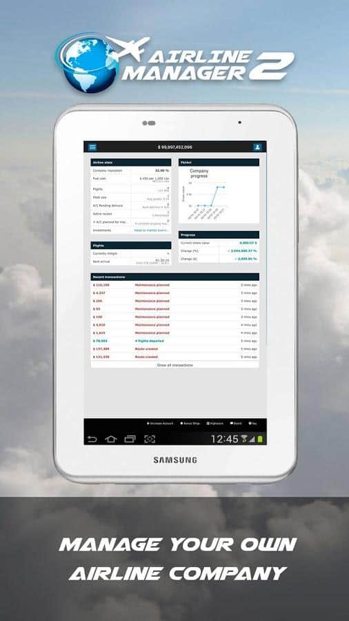 Airline Manager 2 – отличный симулятор на андроид, где вы станете менеджером авиакомпании. В этой игре вашей главной задачей будет увеличить доходы своей компании, а для этого вам необходимо покупать самолеты, нанимать на работу опытных пилотов, следить за рынком пассажирских и грузовых перевозок и расширять свои филиалы в разных странах. Постоянно следите за своим персоналом, проводите маркетинговые компании и создавайте холдинги. Если у вас все получится то, новые инвесторы начнут вкладывать в вашу компанию деньги и развивать ее, а вы получать прибыль. Также в этой игре вы сами сможете стать инвестором, который находит стоящие компании и вкладывает деньги в них.