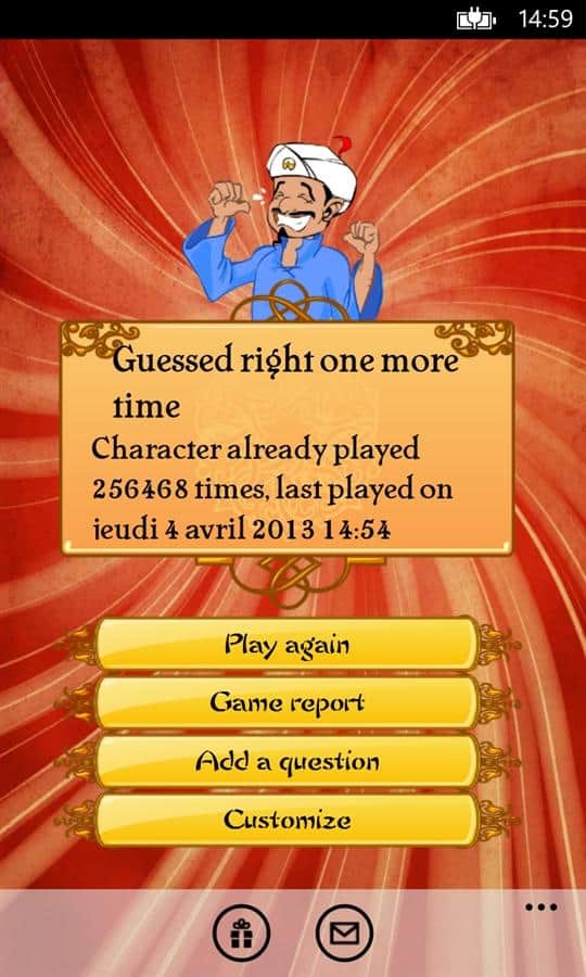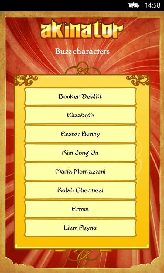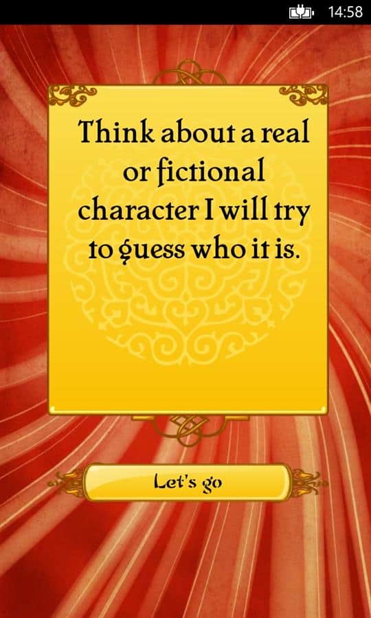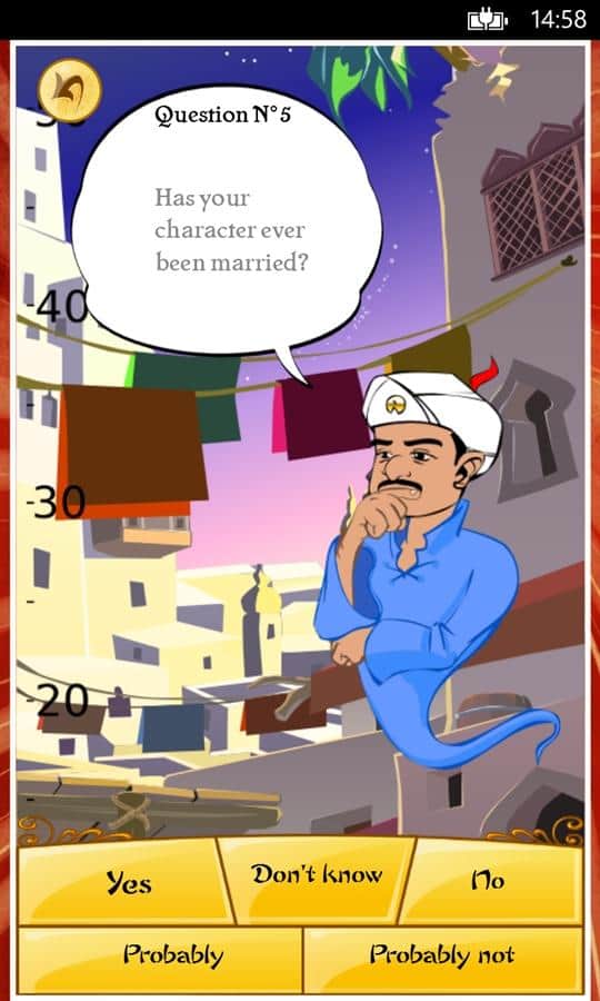 Akinator - это необычная игра для Windows Phone. Ее изюминка в том, что вы бедет общаться с настоящим джином и не просто общаться, а загадав определенный персонаж, вы будете отвечать на вопросы джина и буквально через несколько вопросов, он назовет вам того, о ком вы думали. Это просто поражает. Постарайтесь отвечать так, чтобы джину было сложно отгадать, но отвечайте правдиво! Игра понравится любому возрасту, а для детей есть специальный режим. Вы также можете загружать фото и описание ваших родных и друзей и потом удивить их, когда джин вдруг назовет их имя! Для работы нужен интернет.