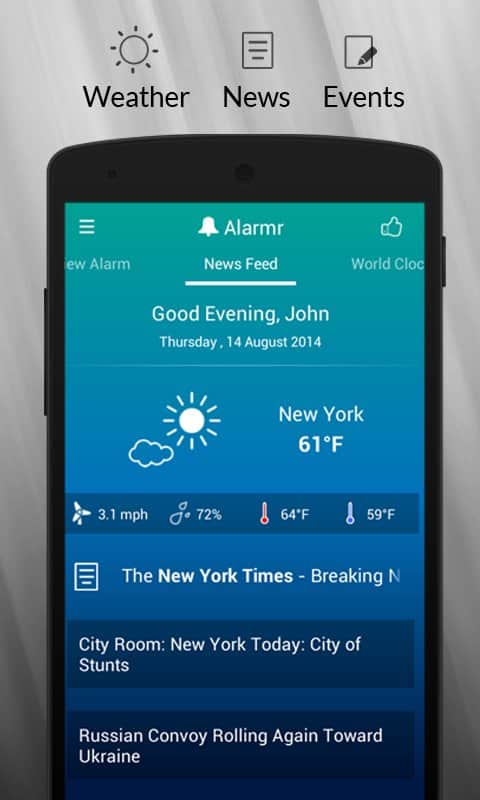 Alarmr : Wake up alarm clock - это приложение обязательно пригодится вам в повседневной жизни. Будильник – это то, что сопровождает многих людей и соответственно, к его выбору нужно относится с полной ответственностью. Ведь « Доброе утро» начинается именно с него) Приложение выглядит современно и при этом обладает минималистическим дизайном. Помимо основной функции приложение умеет, показывать прогноз погоды в вашем городе, так что вы всегда будете в курсе последних метео новостей. Если вы любите засыпать под свою любимую музыку то «таймер сна» вам обязательно пригодится, по истечению указанного времени музыка просто отключится.