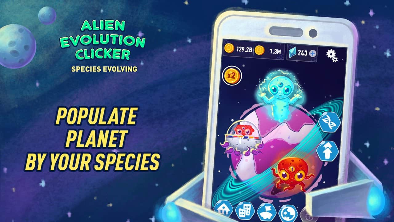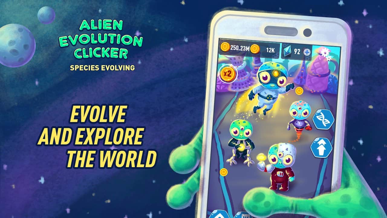 Alien Evolution Clicker: Species Evolving – захватывающая игра на андроид, где вы будете участвовать в эволюции видов. В этой игре вы перенесетесь на другую планету, где только зарождается жизнь и будете смешивать и соединять различных существ, чтобы получить сверхразум и высокоэнергетических существ. Создавайте на своей планете новые виды от обычных простейших до рыб, раков, ящеров и обезьян, а если повезет то и зеленых человечков. Получайте кристаллы и ускоряйте тем самым эволюцию. Ставьте различные эксперименты со смешиванием генов и получайте совершенно новые виды.