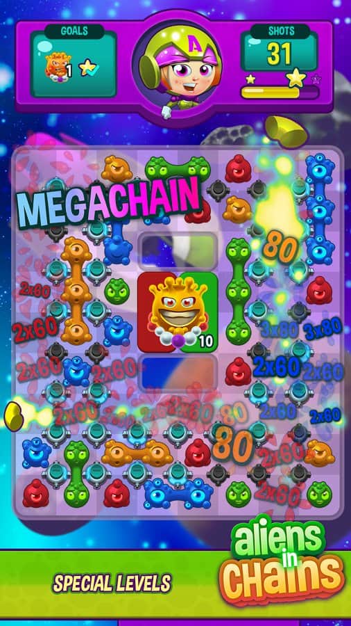 Aliens in Chains – путешествуйте вместе с главной героиней по бескрайней галактике и уничтожайте пришельцев. В этой игре перед вами откроется поле, на котором находятся пришельцы, вашей задачей будет активировать специальный лазер, с помощью которого вы будете разрушать цепочки пришельцев. Применяйте свою логику и сообразительность, чтобы как можно быстрее пройти все уровни и затратить как можно меньше ходов. Решайте непростые задачки и головоломки и взрывайте цепочки с пришельцами. Играйте в эту игру и старайтесь установить свой неповторимый рекорд, соревнуясь со своими друзьями.