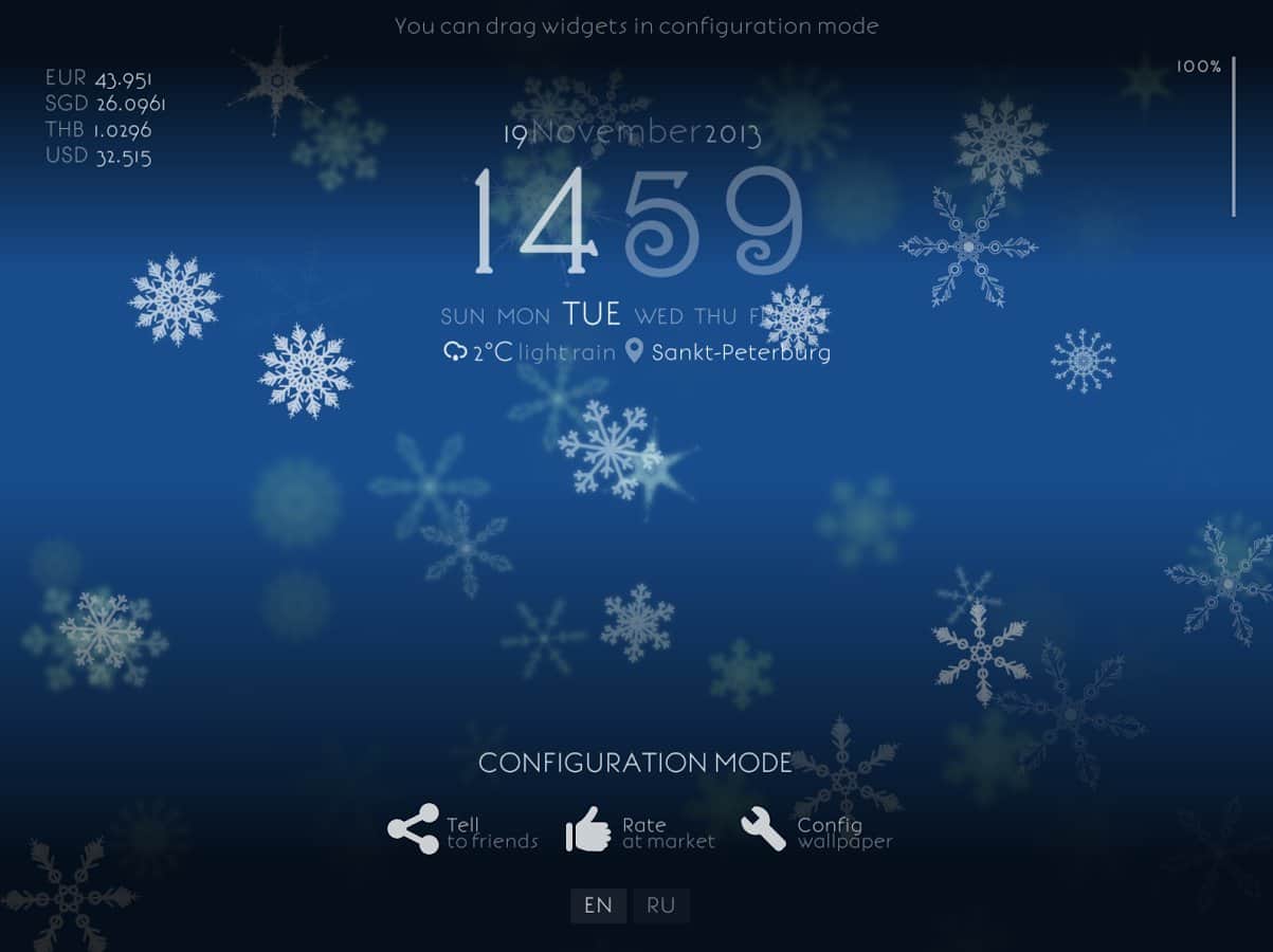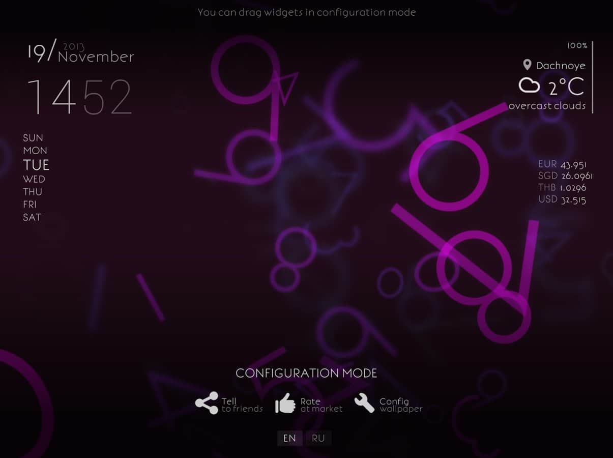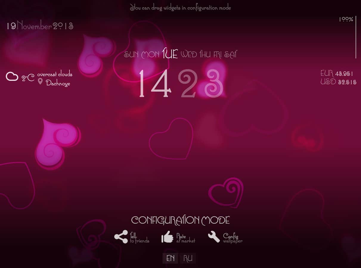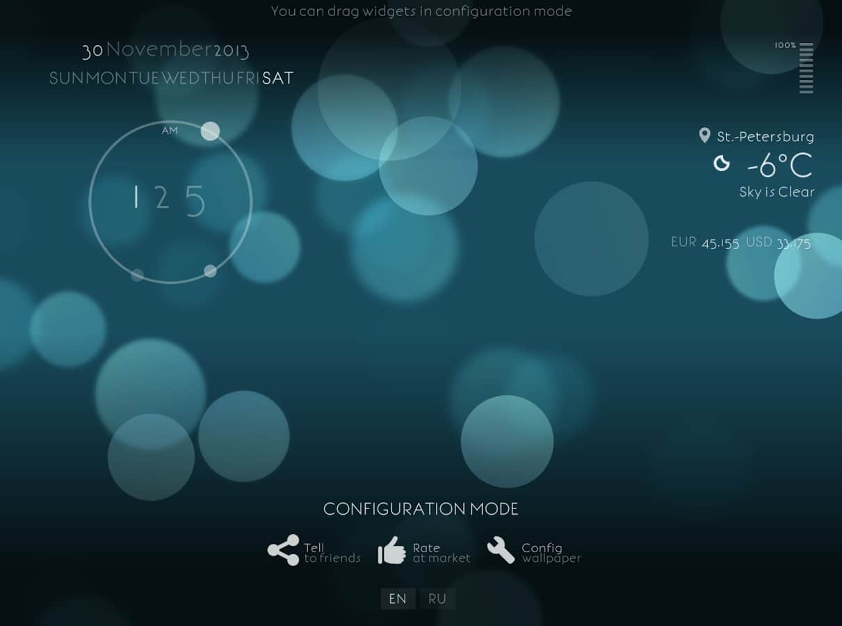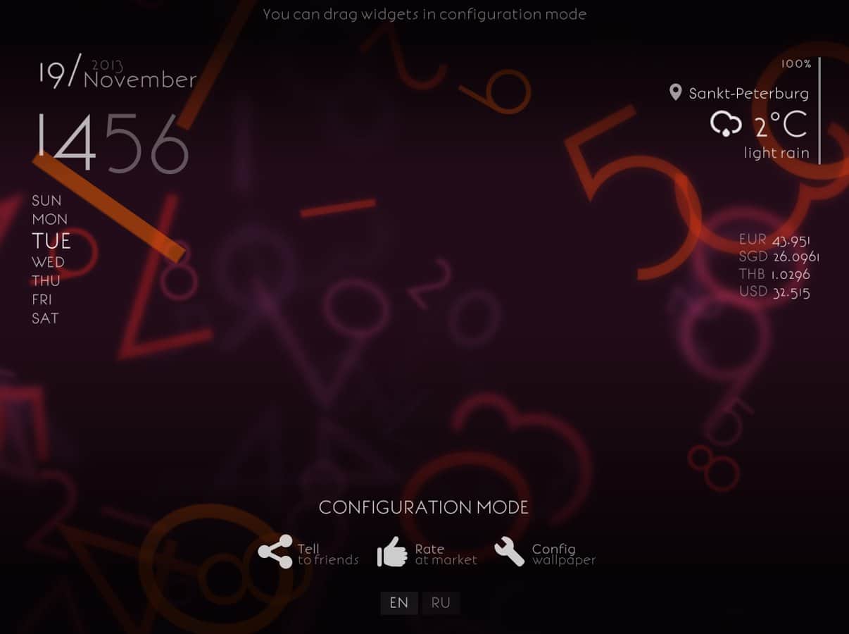 - Прогноз погоды, часы, день недели, дата, курсы валют, заряд батареи - в режиме настройки можно произвольно разместить на экране.