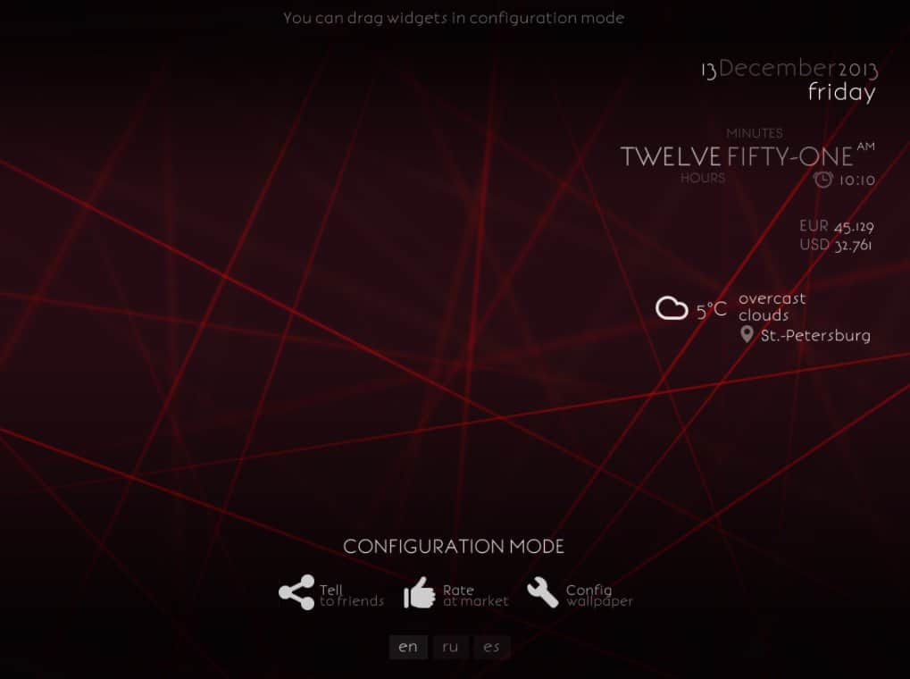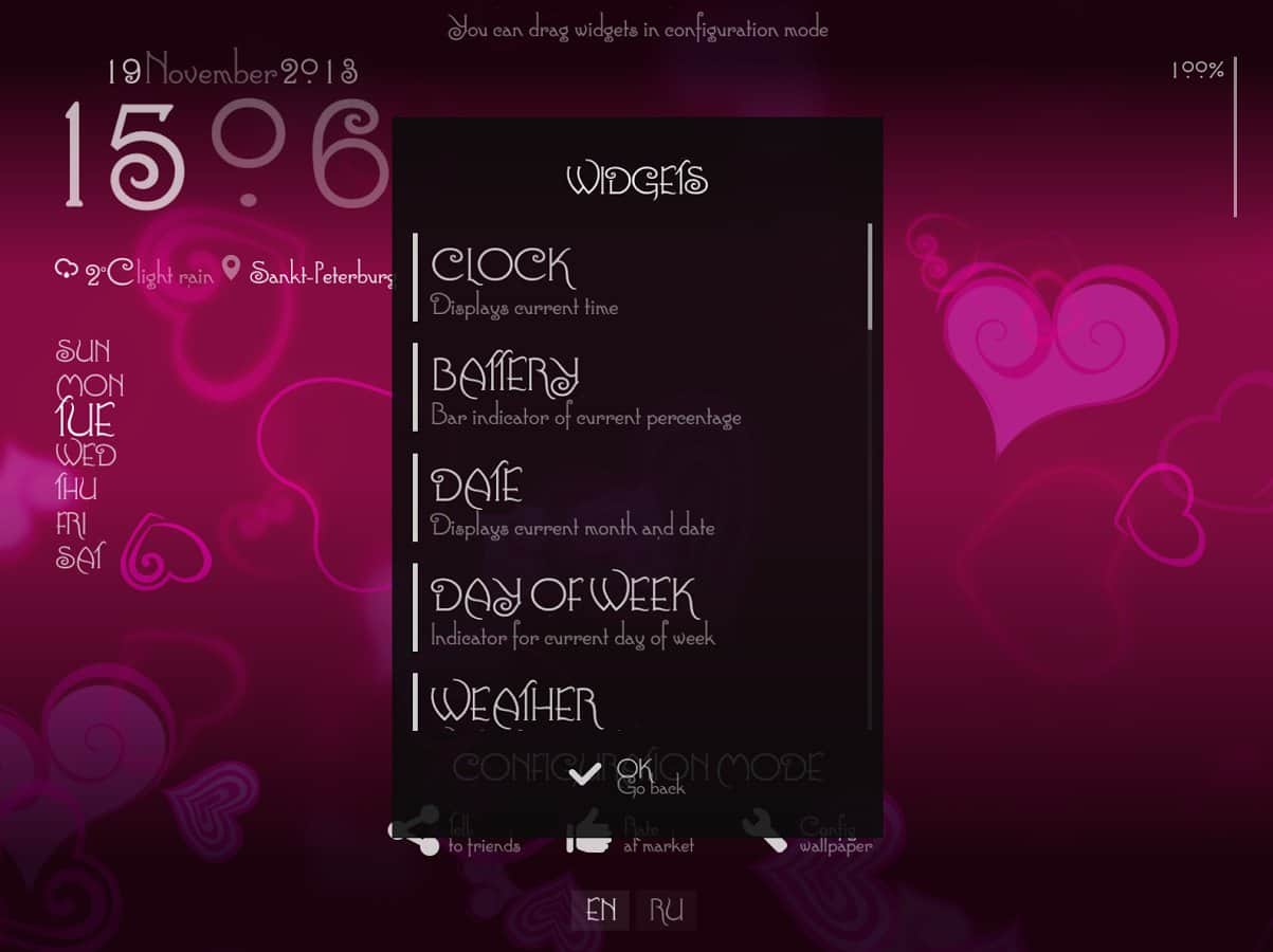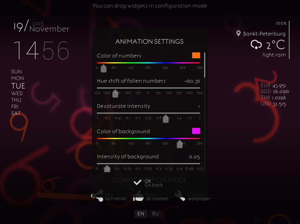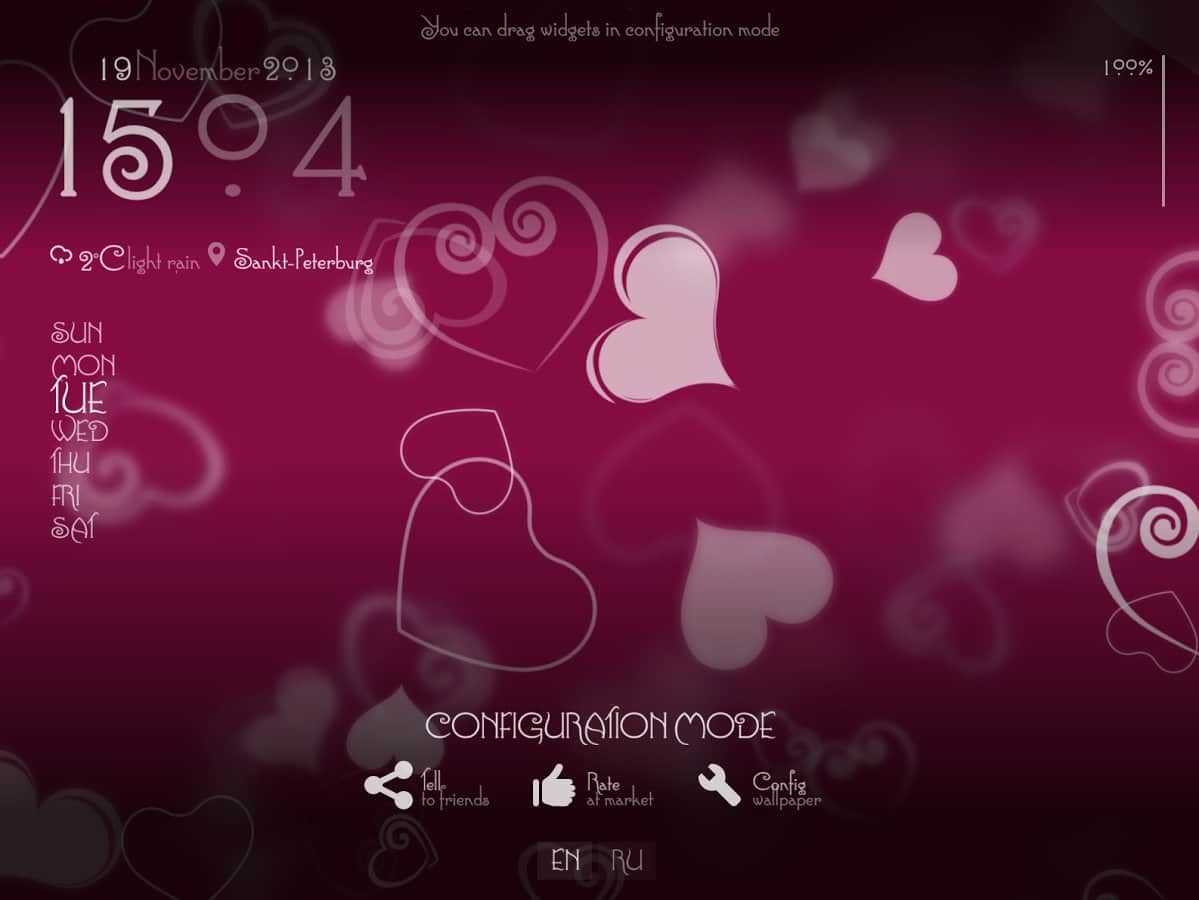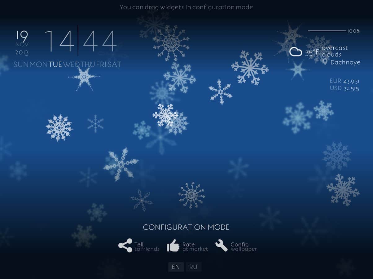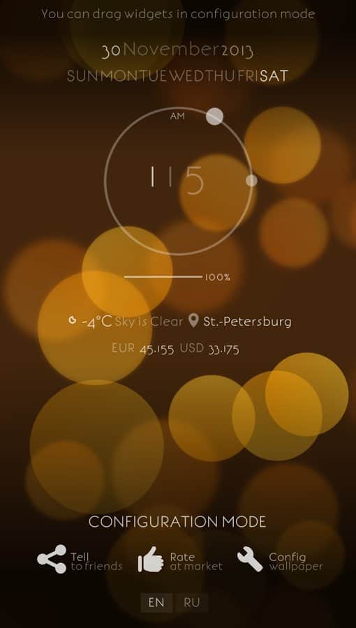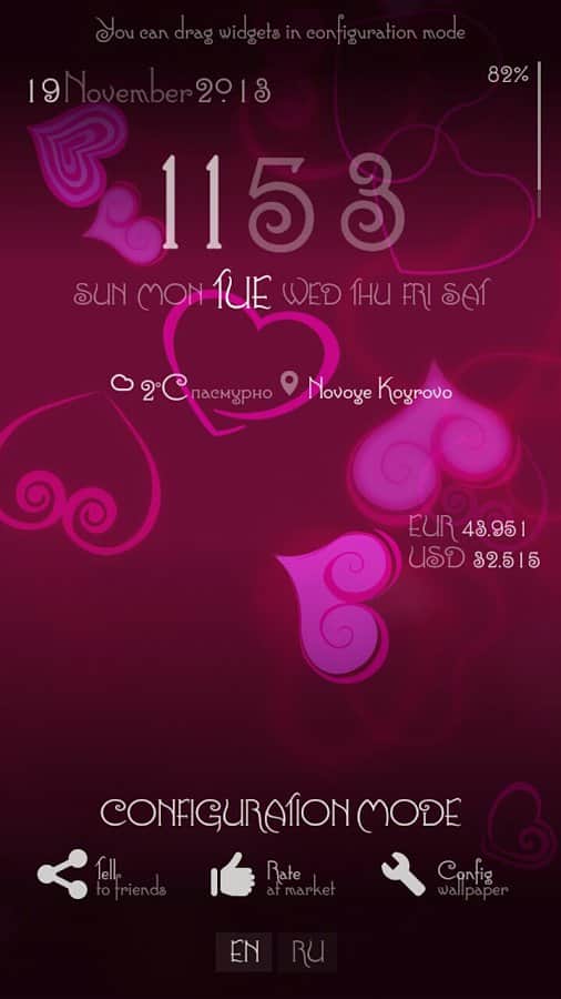 - Прогноз погоды, часы, день недели, дата, курсы валют, заряд батареи - в режиме настройки можно произвольно разместить на экране.