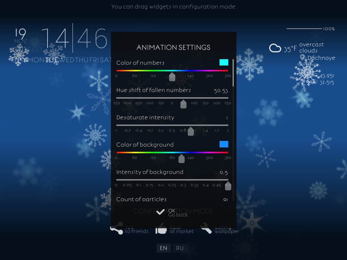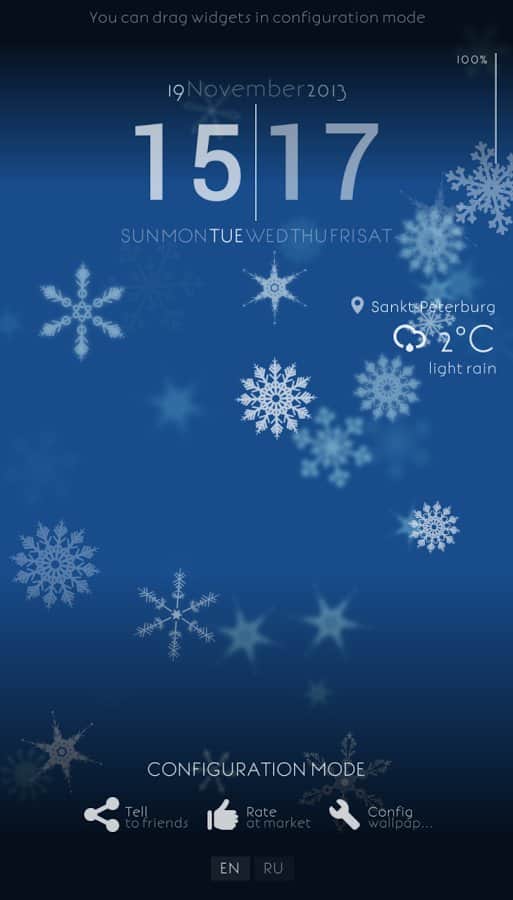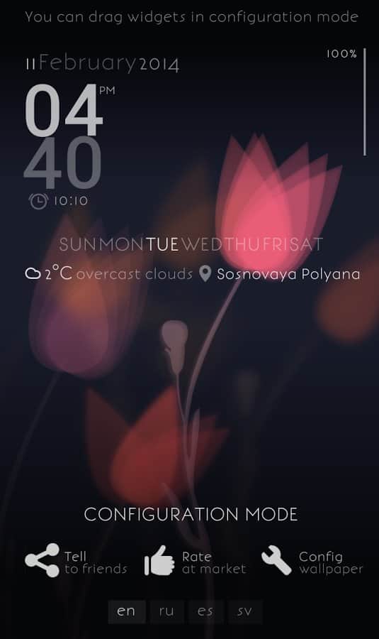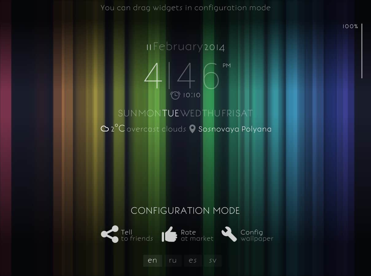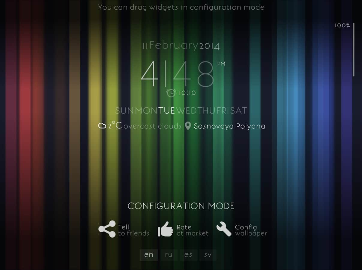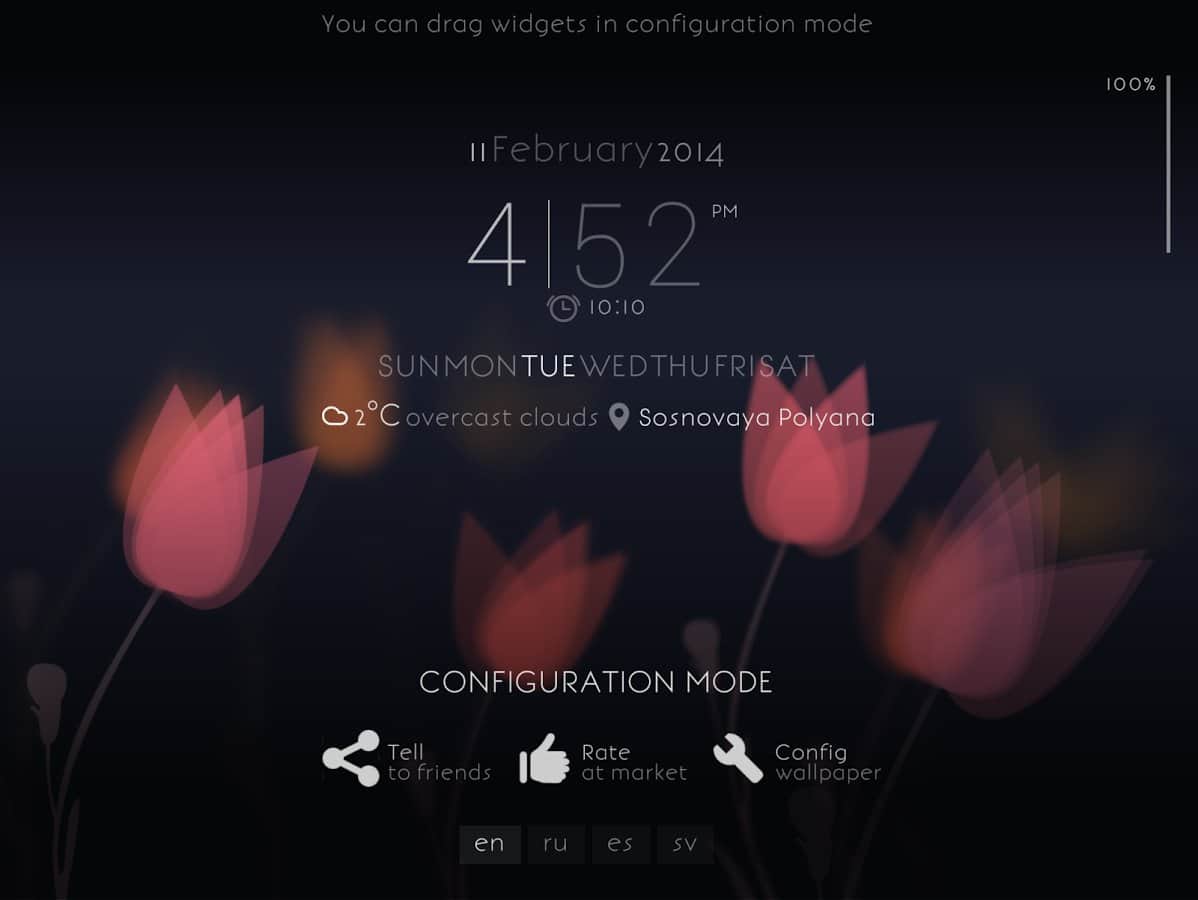- Прогноз погоды, часы, день недели, дата, курсы валют, заряд батареи - в режиме настройки можно произвольно разместить на экране.