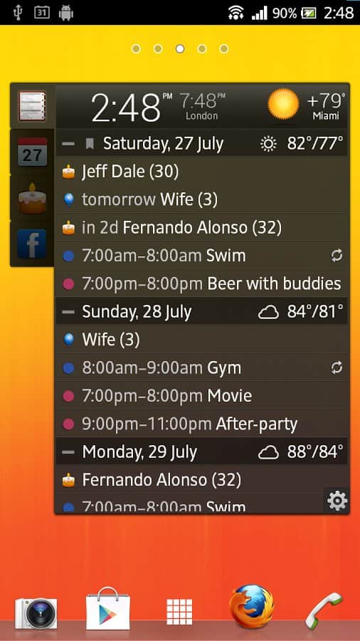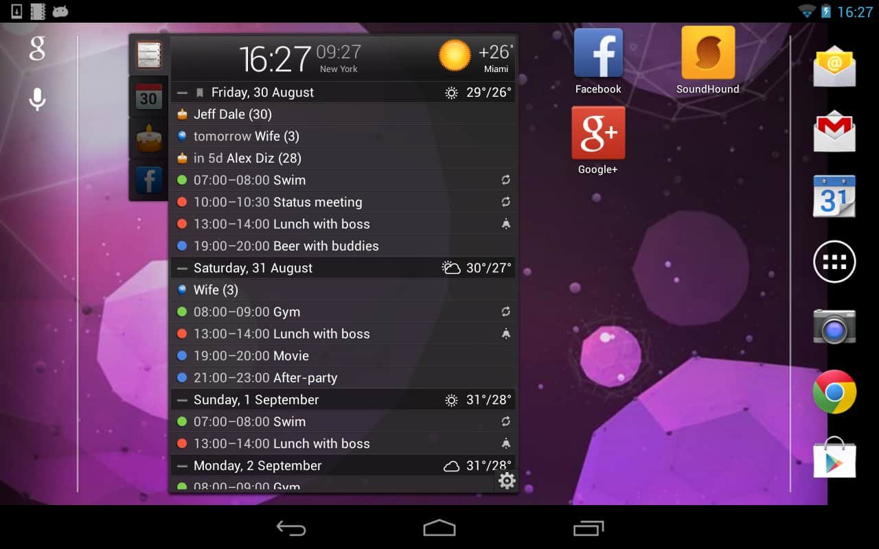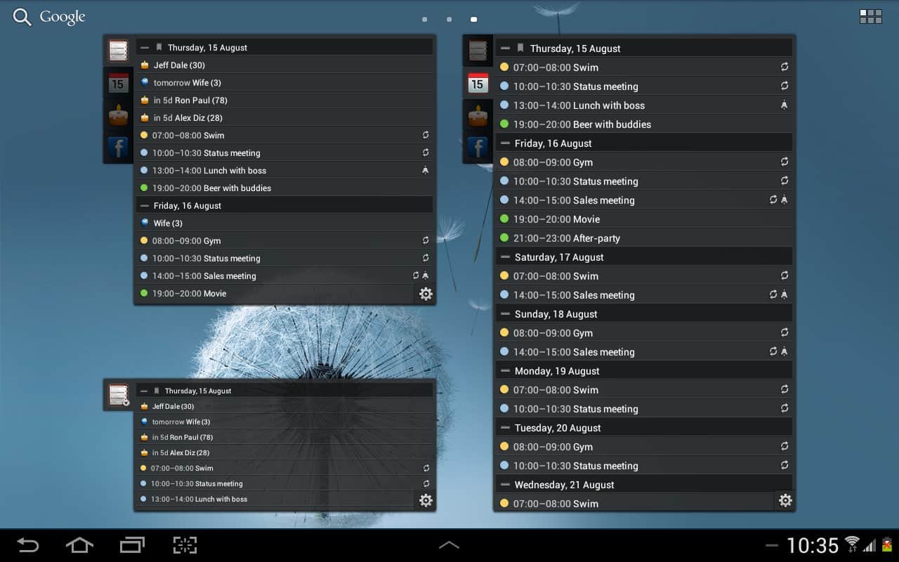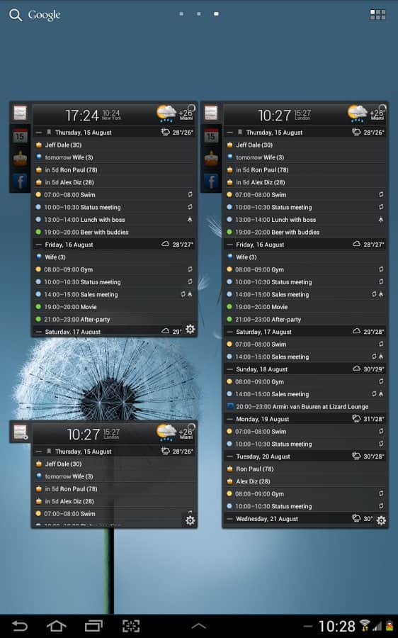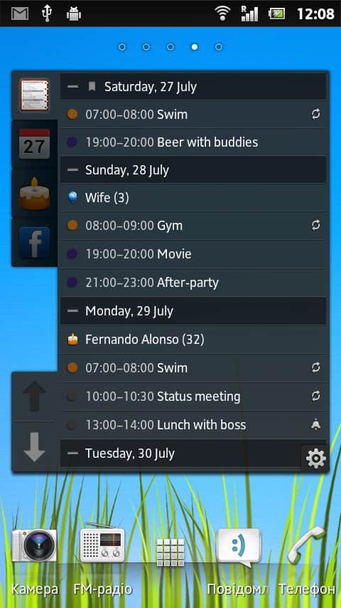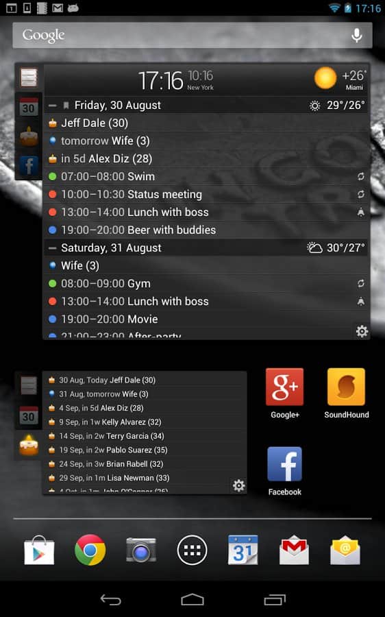 Рабочие столы переполнены разнообразными информационными виджетами? Есть способ объединить всю разрозненную информацию в один блок. Здесь вы найдете расписание на день из календаря, приближающиеся дни рождения, данные из Facebook и прогноз погоды. Прямо из виджета можно с легкостью добавлять новые события или переходить к настройкам. Единственная возможная сложность — в виджете используется довольно мелкий шрифт он позволяет вывести на экран максимум информации, он же может стать камнем преткновения для слабовидящей публики.