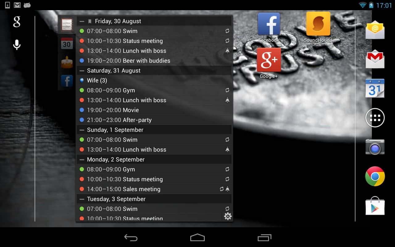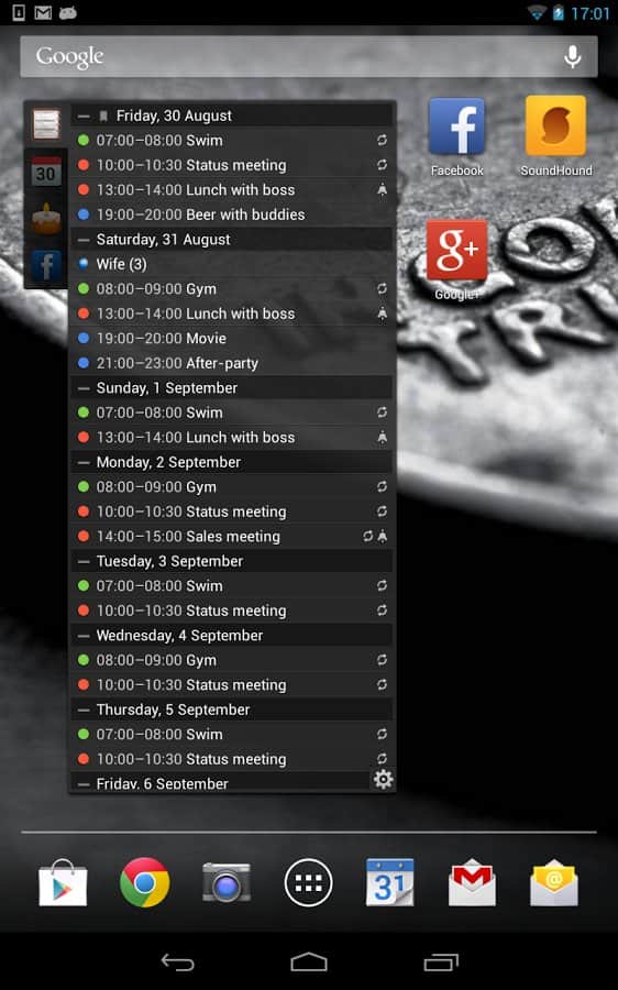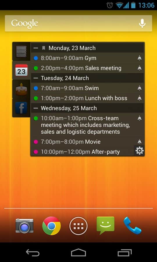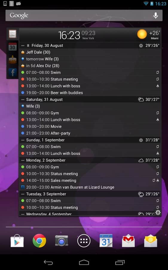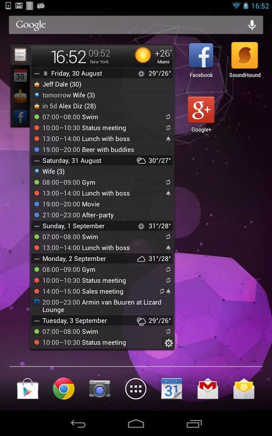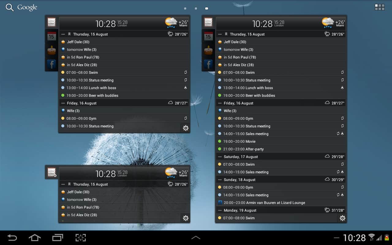 Рабочие столы переполнены разнообразными информационными виджетами? Есть способ объединить всю разрозненную информацию в один блок. Здесь вы найдете расписание на день из календаря, приближающиеся дни рождения, данные из Facebook и прогноз погоды. Прямо из виджета можно с легкостью добавлять новые события или переходить к настройкам. Единственная возможная сложность — в виджете используется довольно мелкий шрифт он позволяет вывести на экран максимум информации, он же может стать камнем преткновения для слабовидящей публики.