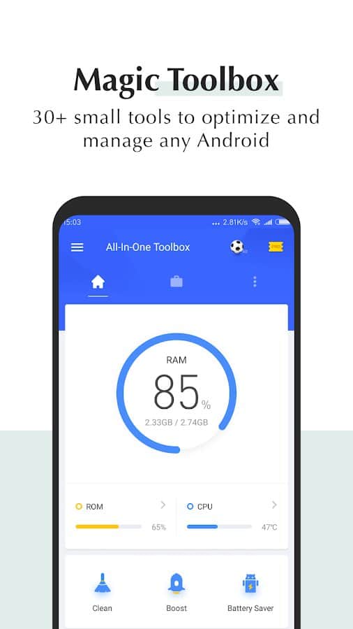 All-In-One Toolbox - Держите свой девайс в чистоте, ведь это очень важно, и на прямую влияет на качество его работы, и срок службы. Данное приложение, создано для того что бы вы не захламляли свое устройство. Оно поможет вам избавится от старых файлов, которыми вы не пользуетесь, или которые остались после удаления игр и программ, и всего лишь захламляют вам смартфон. Вы так же сможете следить за быстродействием вашего устройства в реальном времени, и в любой момент, выключить не нужные вам процессы, всего в один клик. Простой и понятный интерфейс, а так же никаких лишних функций, вот что можно сказать про это прекрасное приложение.