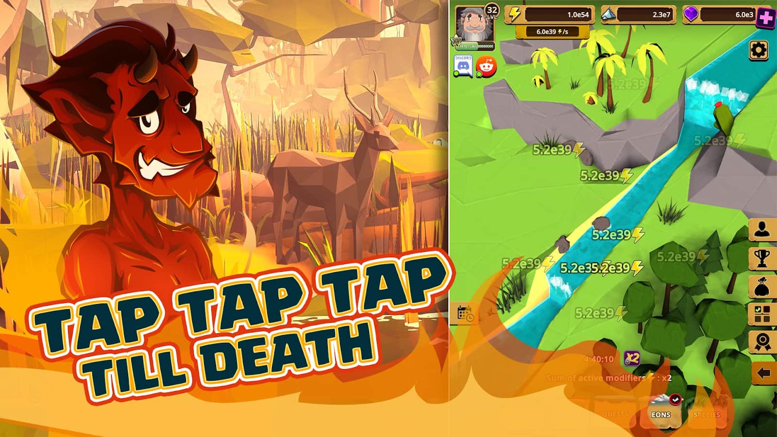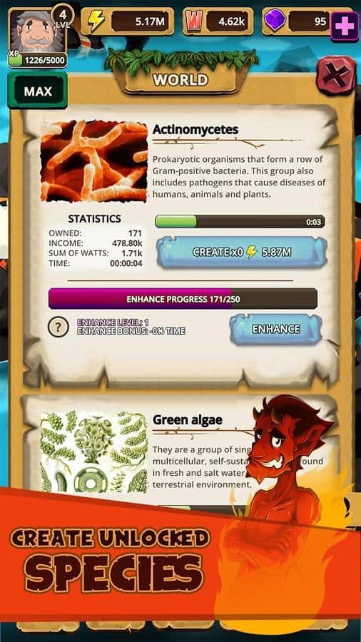 Almighty: God Idle Clicker – занимательный кликер на андроид, где вы будете создавать свой собственный idle-мир. В этой игре вы будете играть роль Бога где будете создавать свой собственный мир. Управляйте своим миром после большого взрыва в результате которого появятся первые живые формы и микроорганизмы. Открывайте для себя легендарных живых существ и добивайтесь отличных результатов заселяя свой мир разнообразными животными и растениями. Выполняйте многочисленные квесты игры и повышайте свою статистику. Кликайте как можно чаще на экран своего телефона или планшета и получайте больше энергии и наград. Наблюдайте за эволюцией видов и погрузитесь с головой в эту игру.