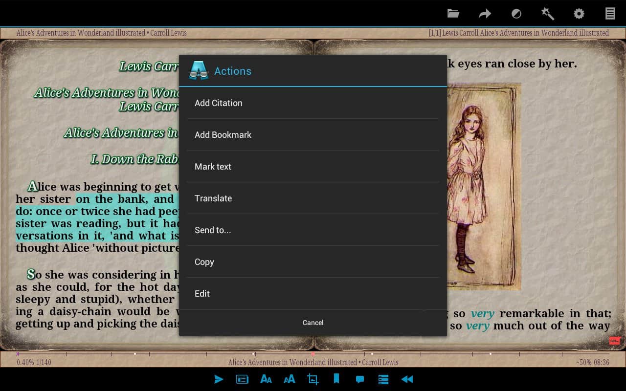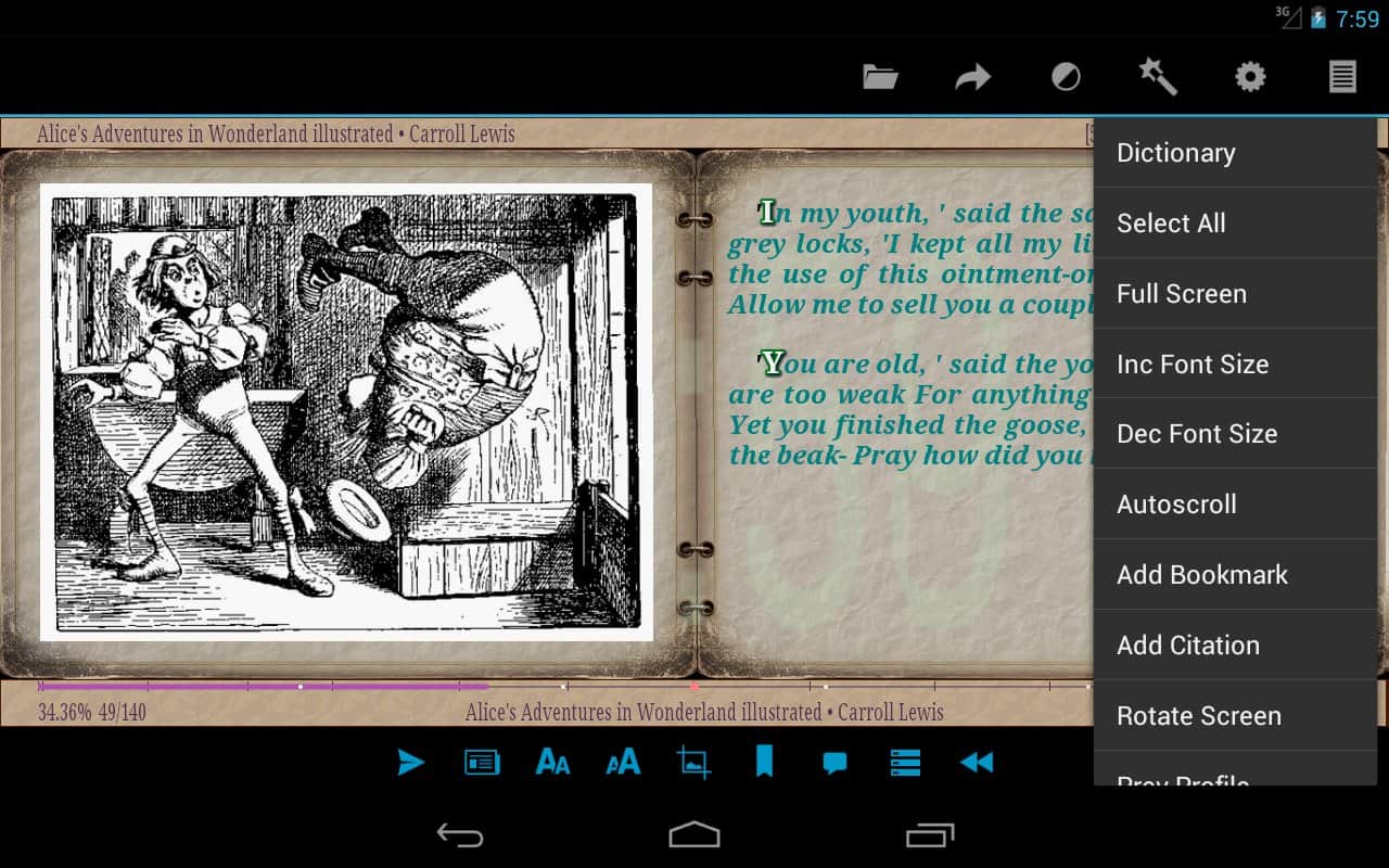 Предусмотрено создание закладок, цитат, если необходимо, маркировка текста. Части читателей понравится возможность подключать словари.