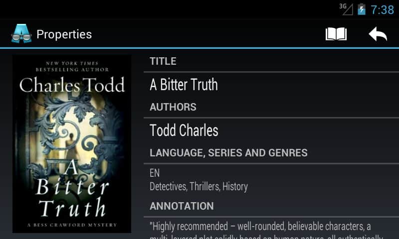 Она может похвастаться приятным и шустрым интерфейсом, поддержкой большого количества форматов (fb2, txt, epub, html, doc, docx, rtf, mobi и др.) и работой с архивами ZIP и GZ, предусмотрен также TTS.