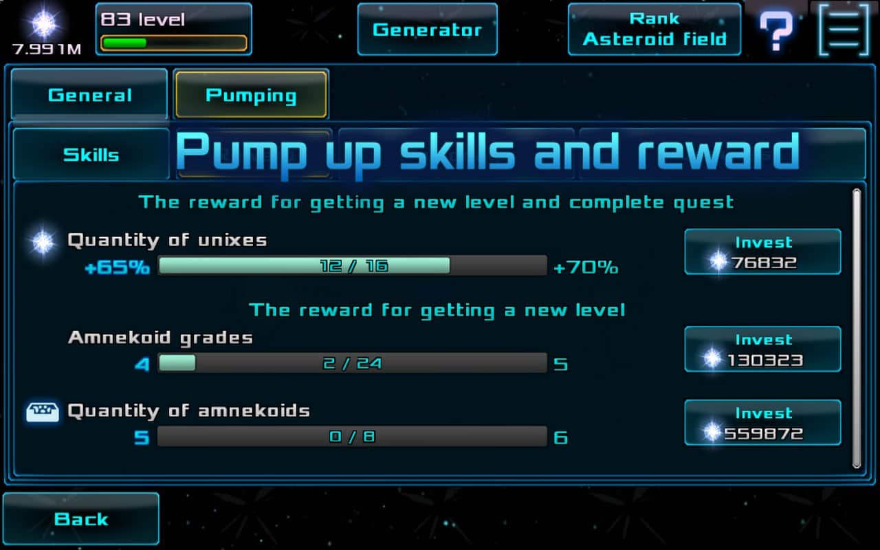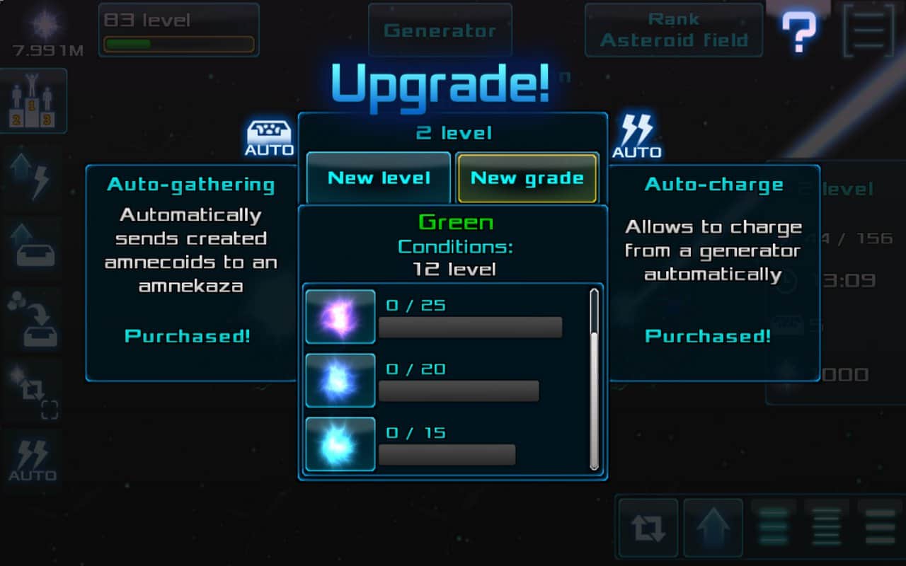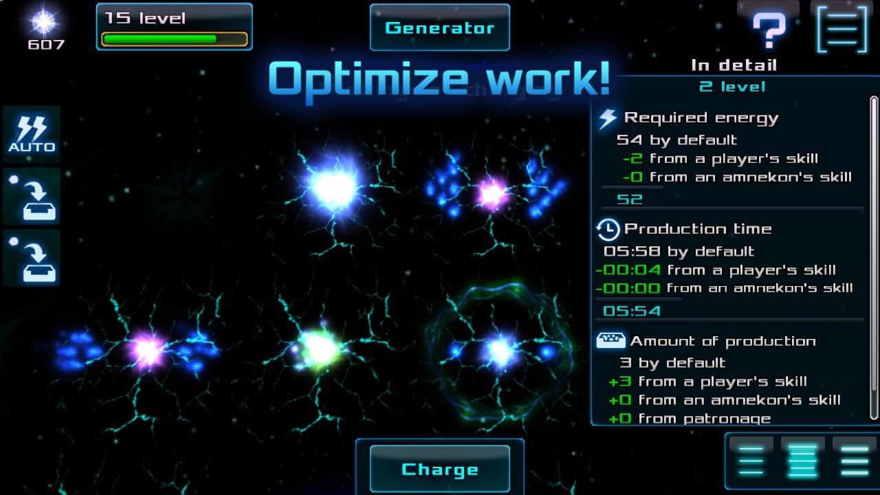 Amneka – экономическая игра, в которой вам предстоит попасть в космическое пространство и улучшать свои амнеконы. Космическое пространство под названием Амнека постоянно увеличивается и расширяет свои мощности, создавая новые ячейки амнеконы. Одна такая ячейка досталась вам, и вашей задачей будет увеличить ее мощность, а также создавать похожие на нее, для продажи на рынке. Развиваясь и расширяя свои ячейки вы станете самым известным поставщиком мощностей.