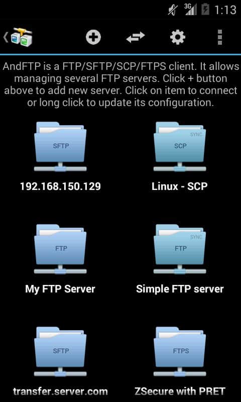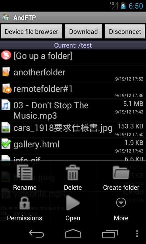 AndFTP — полноценный FTP/SFTP/FTPS клиент для Android с богатыми функциональными возможностями, позволяющий управлять несколькими серверами. Создание папок, возможность выбора папки, переименовывание и удаление файлов, загрузка/выгрузка с поддержкой возобновления, настройка полномочий на FTP сервере, а так же поддержка нескольких FTP серверов и это лишь малая часть возможностей клиента AndFTP.