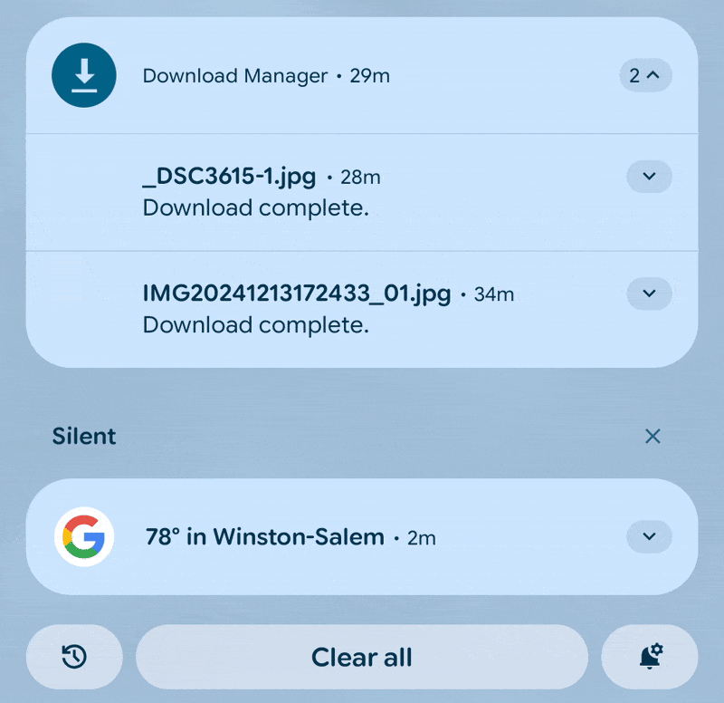 Пользователи получат более крупную кнопку “Очистить все”, рядом с ней будут располагаться ярлыки для быстрого перехода к истории уведомлений и настройкам. Для имеющихся уведомлений предусмотрены “Компактный вид” и “Полный список” — пользователь сможет сам выбрать, какой вариант для него предпочтительнее.