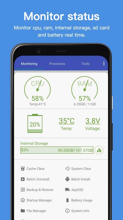 - Мониторинг - память, состояние батареи, загрузка процессора