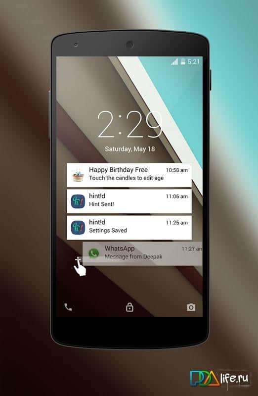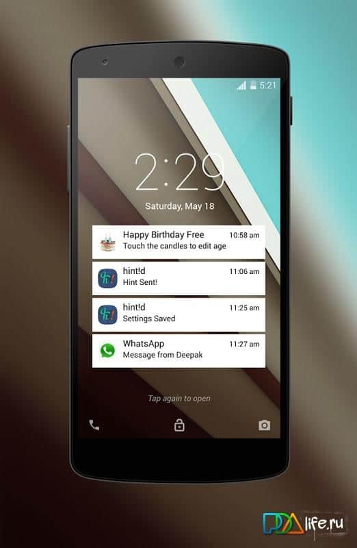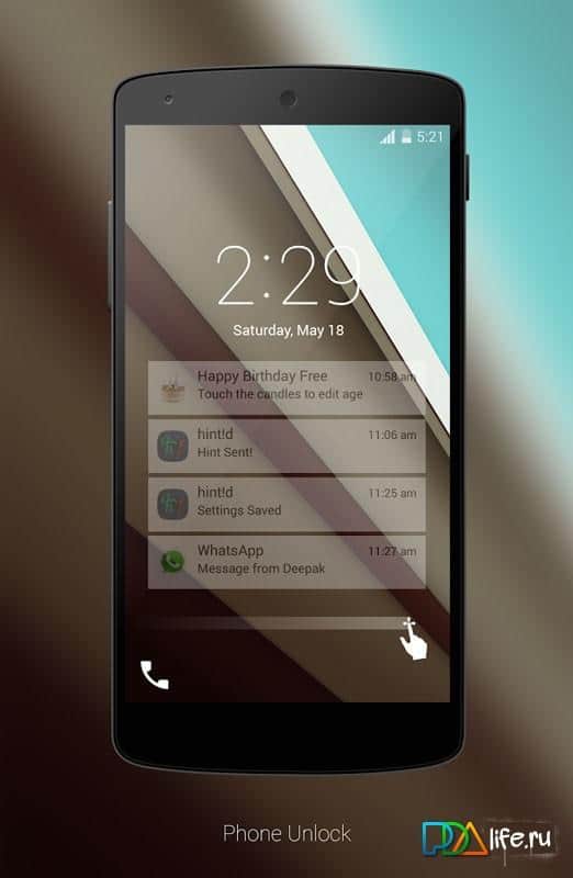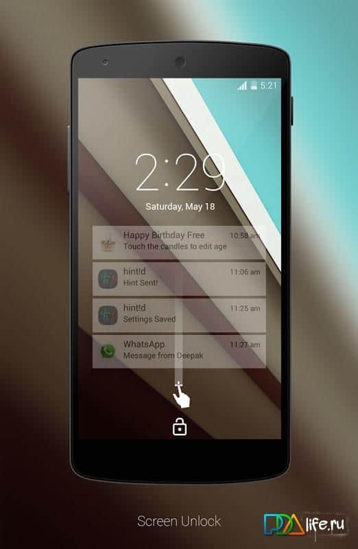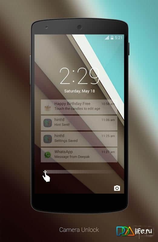 Android L LockScreen – замечательная программа блокировки смартфонов, при разблокировании которой вы запросто запускаете часть функции своего девайса. Так, например, проводя пальцем вправо вы разблокируете камеру, влево Dialer, вверх - непосредственно сам телефон. Доступные обои приложения, могут быть использованы в качестве фона, а назойливые уведомления других программ, внесены в черный список и многое другое.