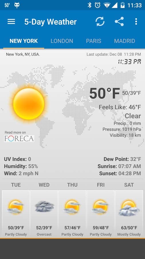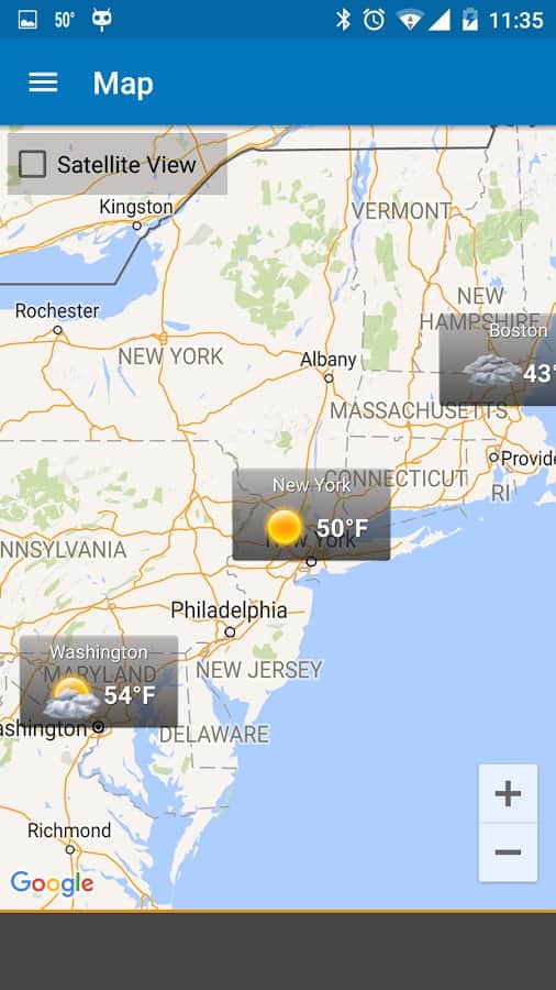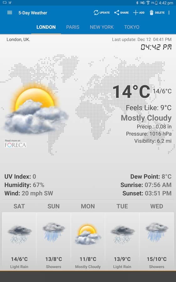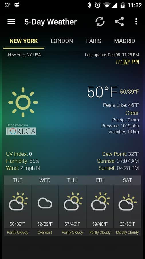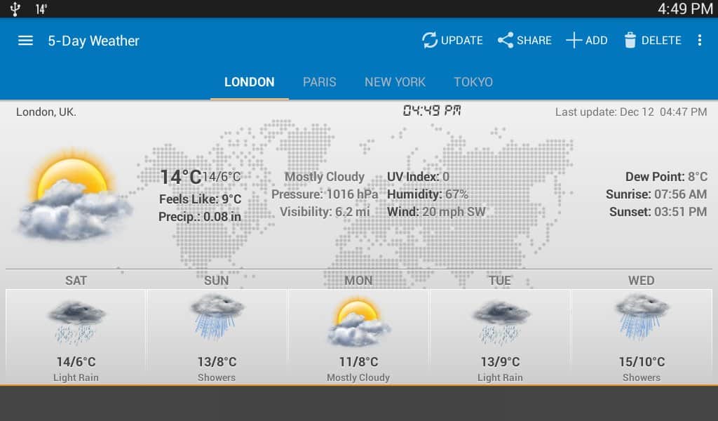 Android Weather – еще один прогноз погоды для андроид устройств от разработчиков Devexpert.NET. Скачайте бесплатно, установите на свой смартфон или планшет и получите точный прогноз погоды на четыре дня по всему миру. Приложение находит нужный вам город довольно быстро предоставляя информацию о влажности, температуре, ветре и пр. Android Weather может обновляться как автоматически (с интервалом, 1 час, 3 часа, 12 часов), так и вручную.