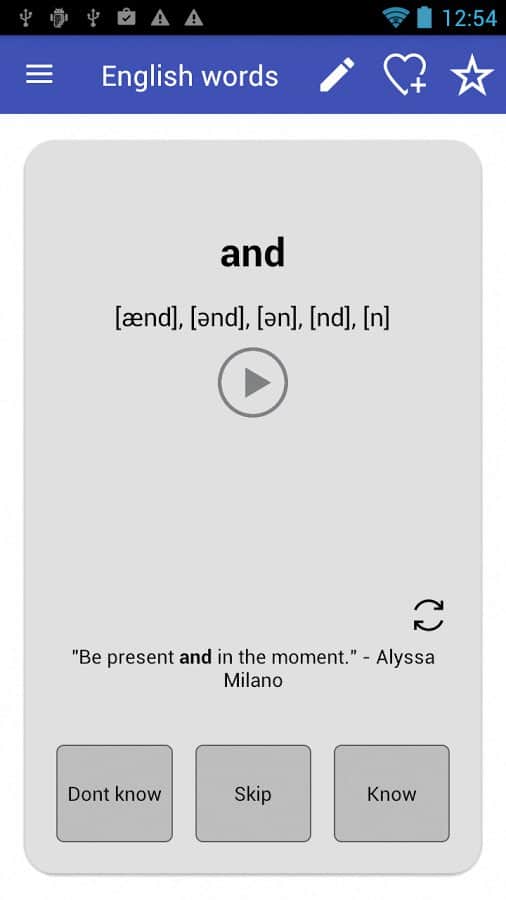 Английские слова - хорошее приложение на андрод, с помощью которого вы запросто сможете выучить 2500 слов наиболее часто употребляемых в английском языке, причем в любое время и любом удобном для вас месте. Для удобства программа содержит транскрипцию слов и функцию настройки количества набора слов, а так же период их повторений.