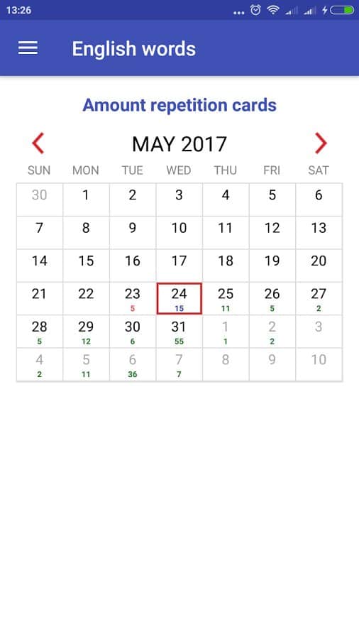 - Настройка количества английских слов в наборе и количества повторений для запоминания слова
