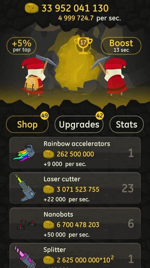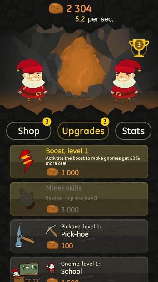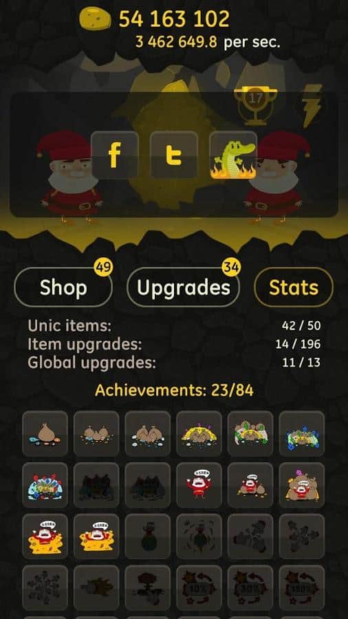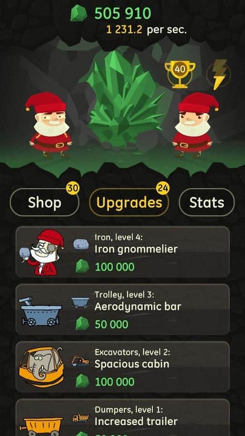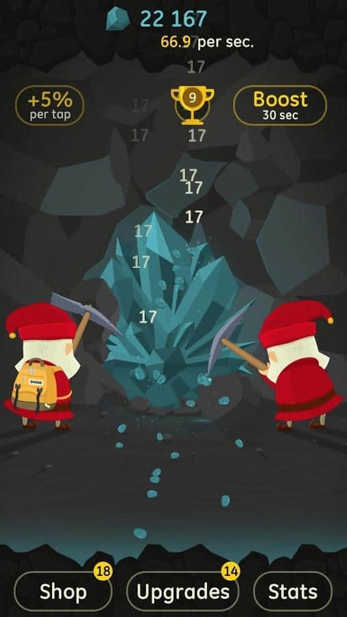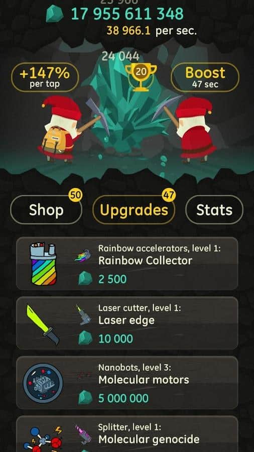 Angry Clicker – кликер на андроид, который порадует вас отличным юмором и хорошей графикой. В этой игре вы будете управлять командой гнуме, которые живут глубоко под землей и добывают различную руду и алмазы. Кликайте как можно чаще по экрану своего телефона или планшета и добывайте руду с помощью каменной кирки. По ходу игры улучшайте своего героя и применяйте различную технику, в том числе галактический расщепитесь, конденсатор антиматерии и распознаватель временных парадоксов, чтобы улучшить работу и добычу руды. В игре представлено более 50 покупок различной техники с возможностью апгрейда, а также 200 улучшений. Для начала научитесь добывать 8 видов руд, прежде чем найти свой первый алмаз.