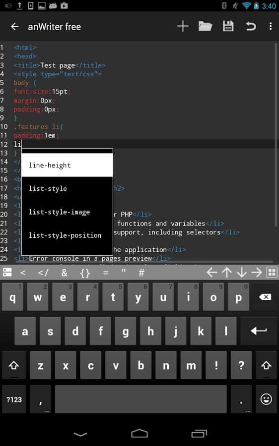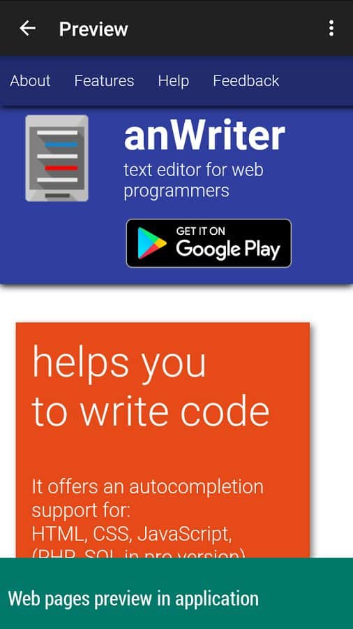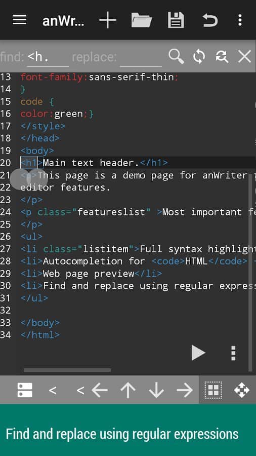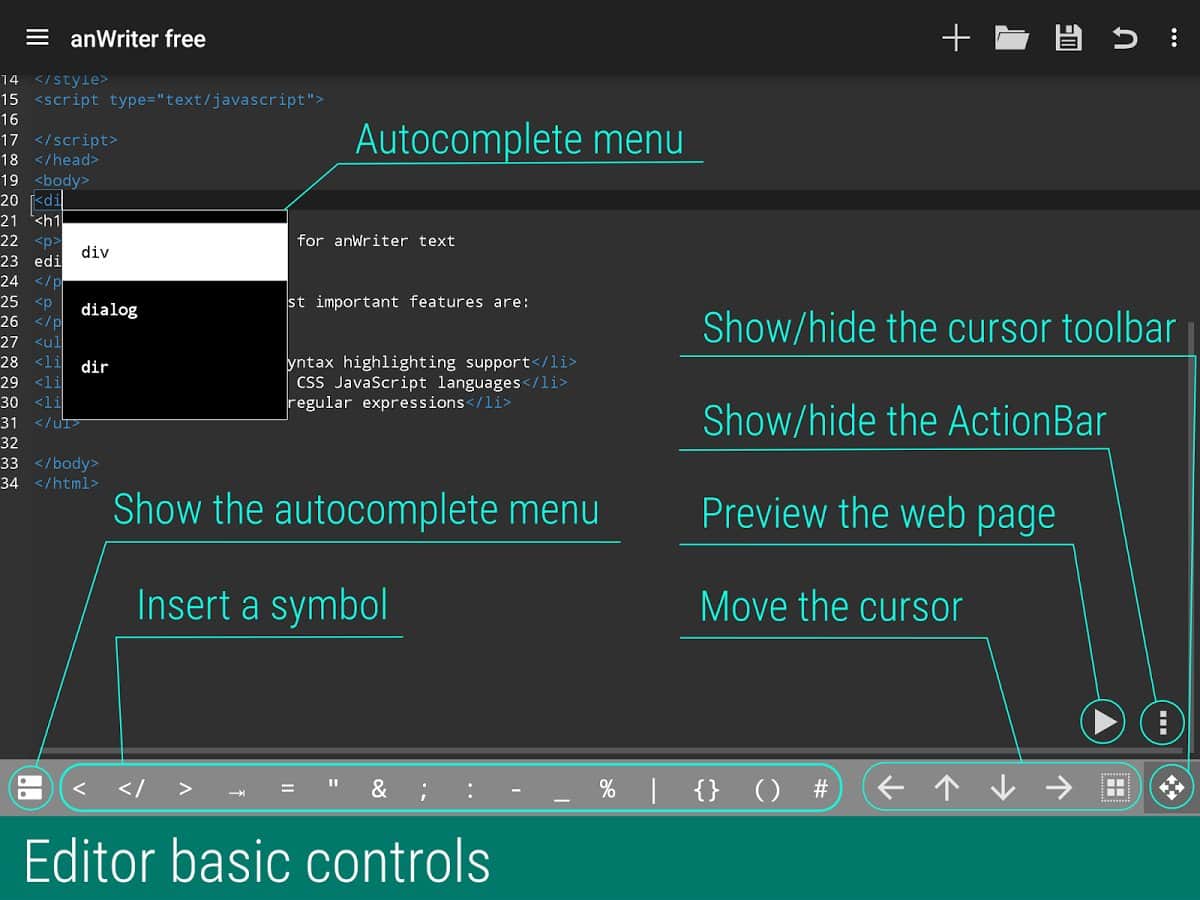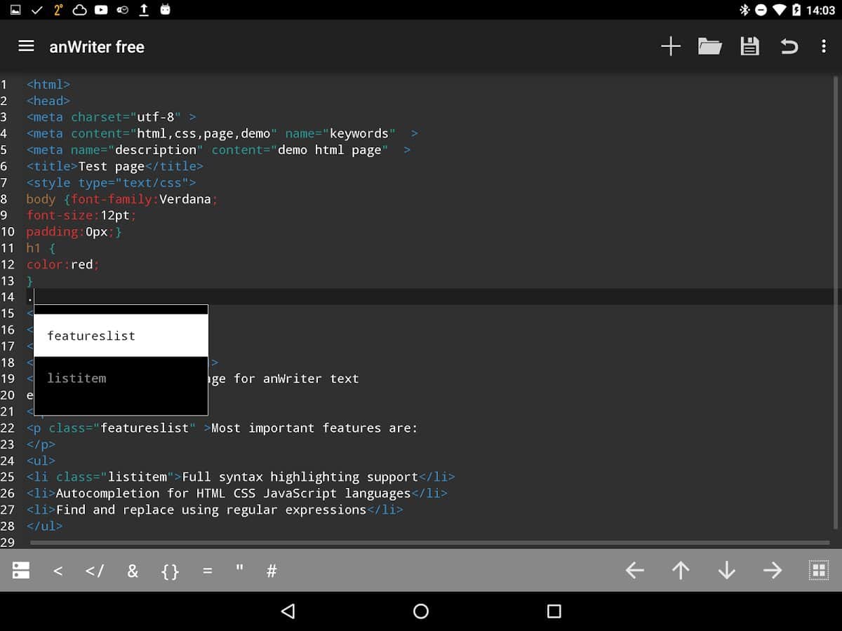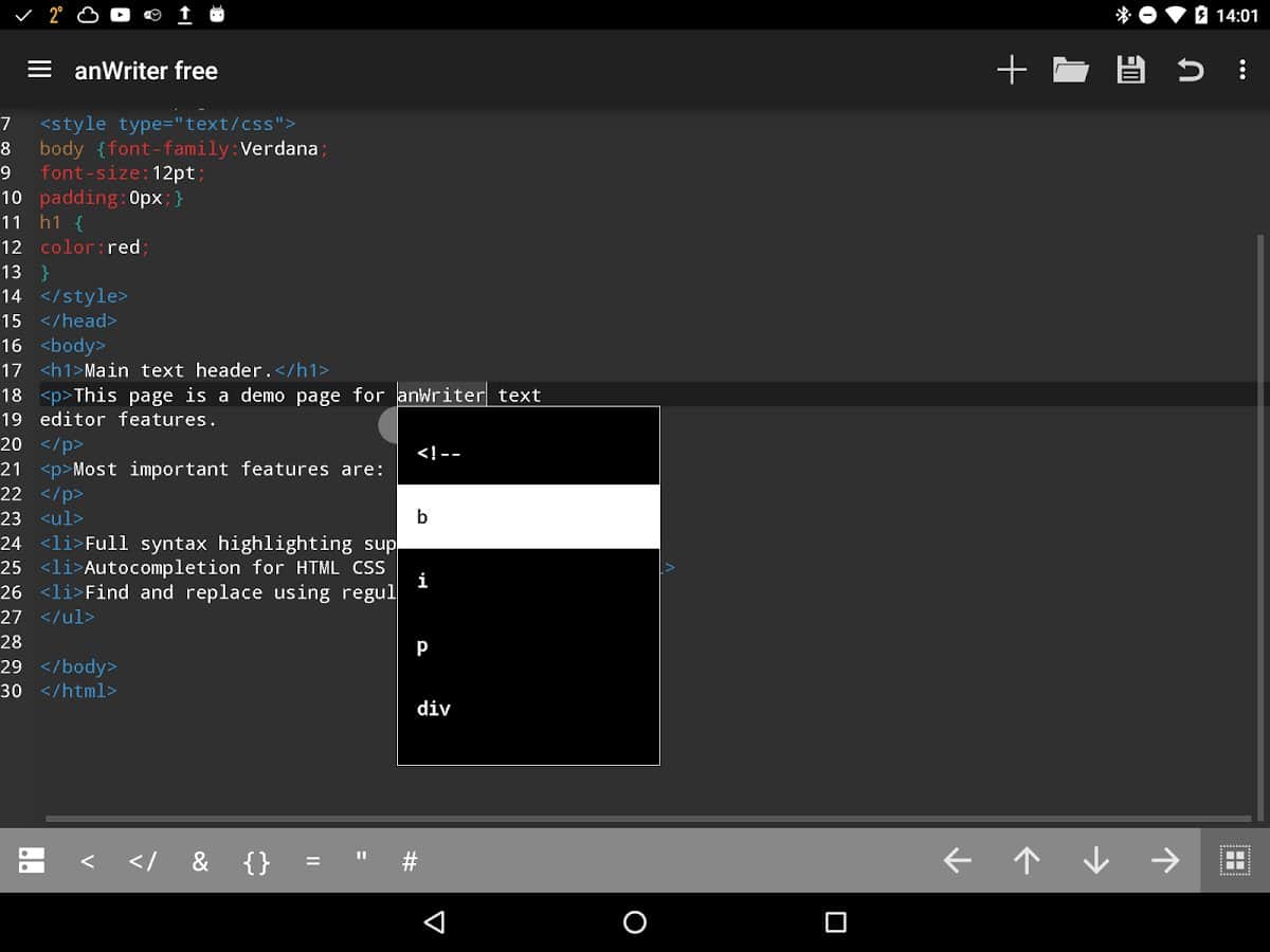anWriter free text editor - На первый взгляд это вполне обычный текстовый редактор, однако если присмотреться получше, то вы поймете что он имеет уйму дополнительных функций. Помимо своих стандартных функций, это приложение так же может: подсвечивать синтаксис, заменять его выдавая готовые варианты, находить ошибки в тексте и многое другое. Так же стоит заметить что оно поддерживает автодополнения для языков HTML, CSS и JavaScript, чтобы значительно облегчить работу для веб-программиста. Но так же вы вполне сможете использовать её как обычный блокнот.