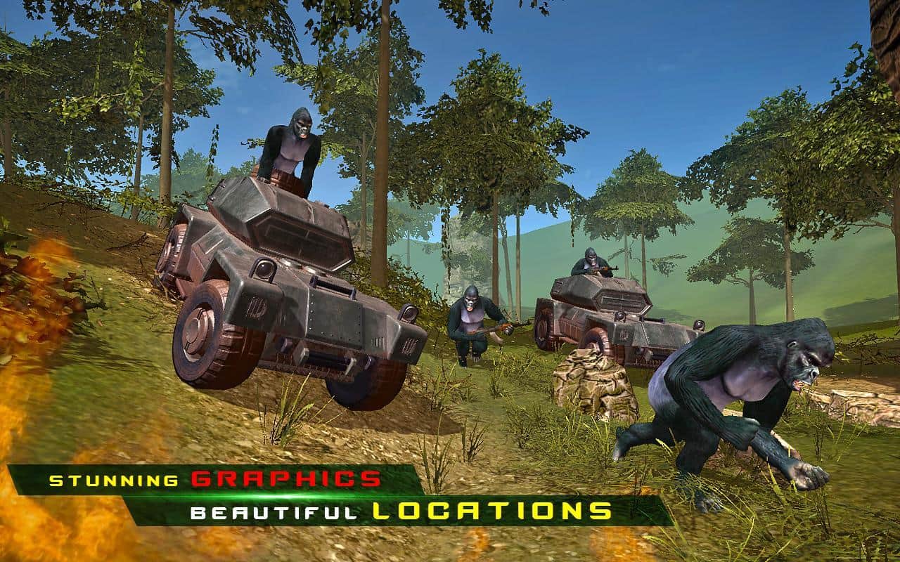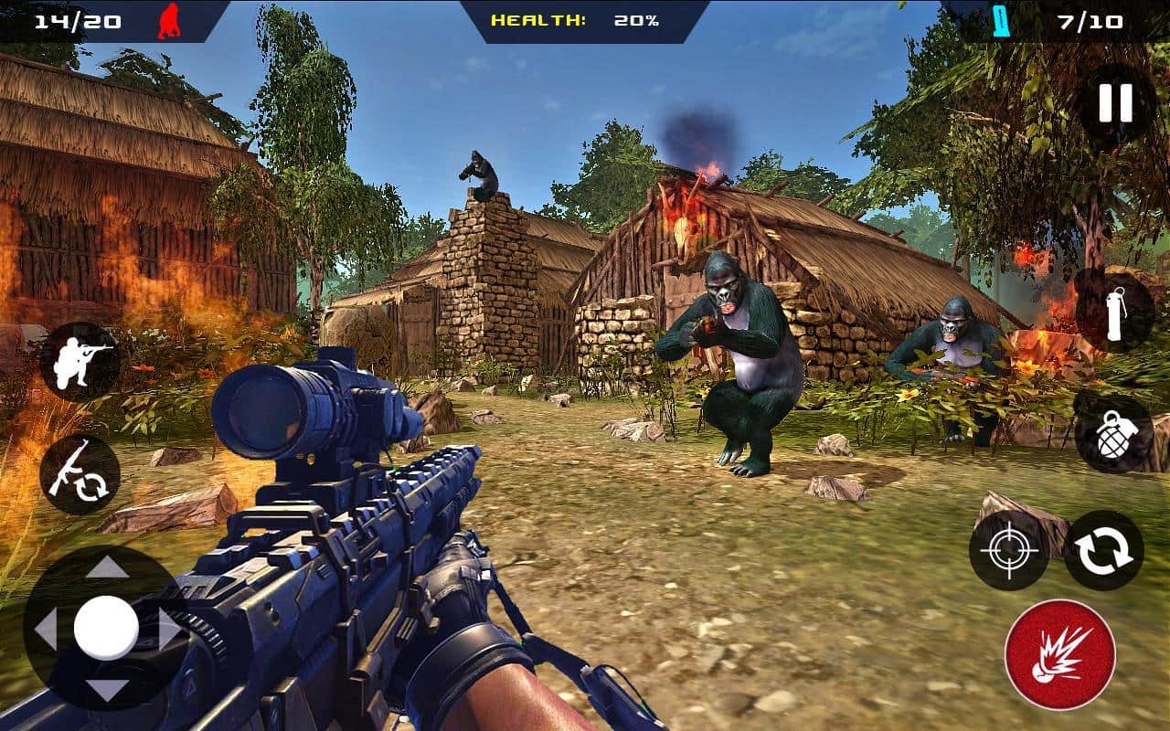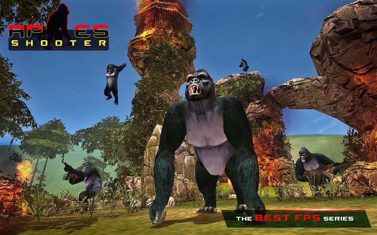 Apes Hunter - Jungle Survival – игра на андроид, где вы отправитесь на тропический остров населенный агрессивно настроенными обезьянами. В этой игре вы столкнетесь с обезьянами, которые будут вооружены до зубов современным оружием и в их планы входит захват мира и порабощение человечества. Берите в руки мощное оружие и занимайте удобную позицию для того чтобы уничтожить как можно больше обезьян. Выполняйте секретное задание правительства и расстройте планы обезьян. Перемещайтесь по различным локациям острова и ведите прицельный огонь по противнику, показывая на деле свою меткость и мастерское владение оружием. На пути вашем встанет большое количество вооруженных обезьян.