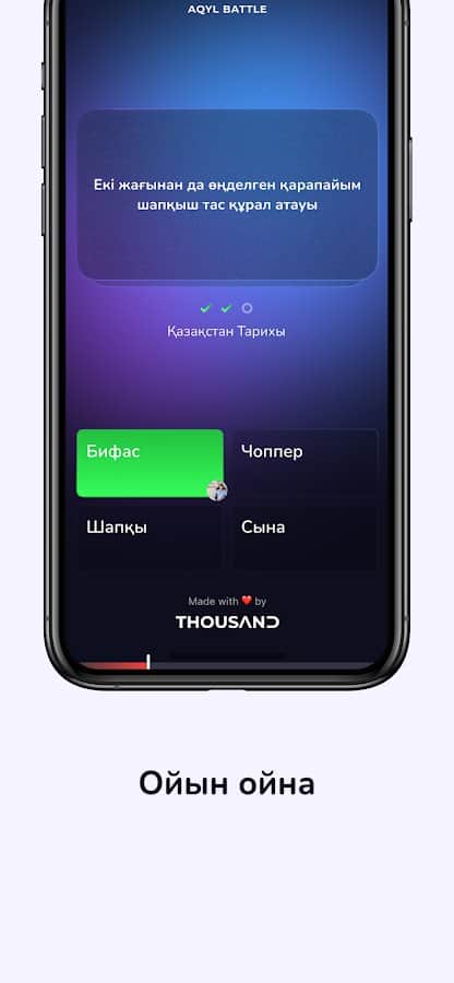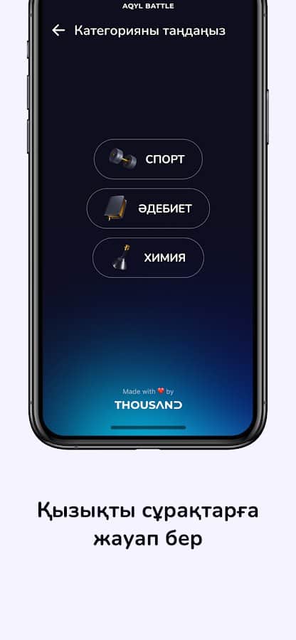 Возьмите участие в викторине и станьте один из самых активных игроков среди других пользователей приложения! Открыв новый профиль, вы прямо сейчас можете приступать к ответам на предоставленные вопросы. Благодаря интересному процессу, у вас есть возможность узнать большое количество новой информации в той или иной выбранной категории: математика, география, казахский, казахская литература, биология, химия, история мира, история Казахстана, мировые новости, медицина, наука-знание, музыка, культура и многое другое!