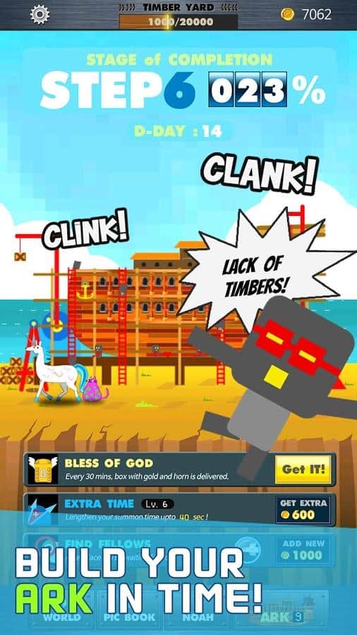 Ark Age – увлекательная игра на андроид, где вам предстоит построить ковчег. Близиться Великий потоп и вашей задачей будет спасти как моно больше животных в своем ковчеге. Сложность в этой игре заключается в том, что помимо строительства ковчега на вас будут нападать различные монстры, не давая вам закончить строительство. Доставляйте на борт ковчега различных животных и собирайте из них непобедимую команду для борьбы с монстрами. Нажимайте на экран и наблюдайте за тем, как животные будут атаковать монстров. Развивайте своих животных, добавляя им силы и дополнительных способностей. Путешествуйте по пяти различным эпохам и собирайте там животных.