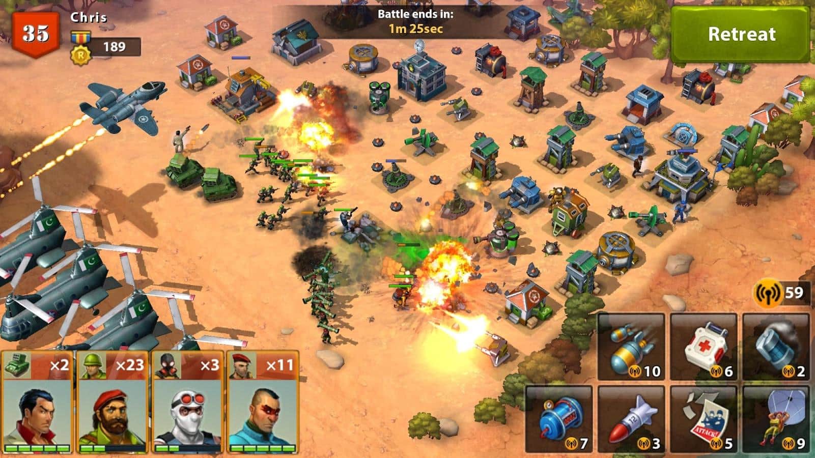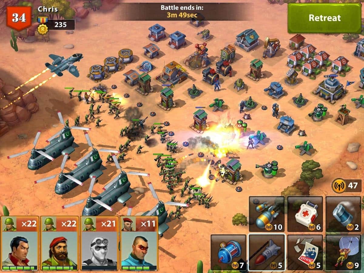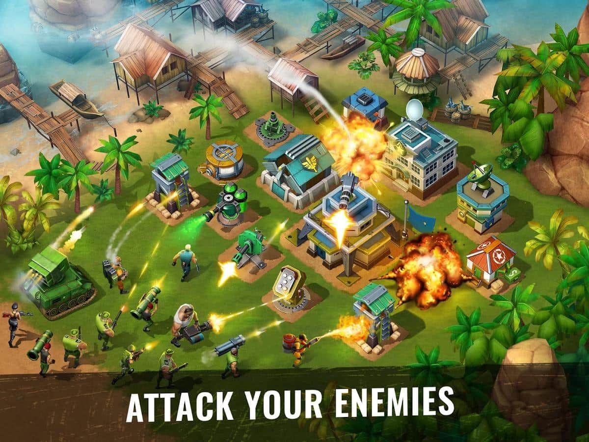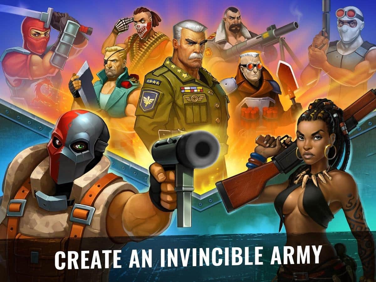 Army of Heroes – станьте настоящим революционером в этой игре на андроид, и свергните диктатора захватившего власть в тропической стране. Вашей главной задачей будет создать свой военный пост и превратить его в огромную базу. Соберите свою армию героев, состоящую из наемников: сумасшедшего пулеметчика, ученого, снайпера и других и высаживайтесь на вражеских базах, используя вертолеты, катера и грузовики. Станьте опытным главнокомандующим и полностью контролируйте свою армию, постоянно меняя цели для атаки. Разрабатывайте свою тактику ведения боя с запрещающими приемами такими как: бомбежка криобомбами и разбрасывание пропагандистские листовки. Захватывайте ключевые объекты в городе: аэропорты, нефтяные вышки, больницы и лаборатории и диктуйте свои правила захватчикам. Прибегайте к помощи друзей сражайтесь с ними бок о бок.